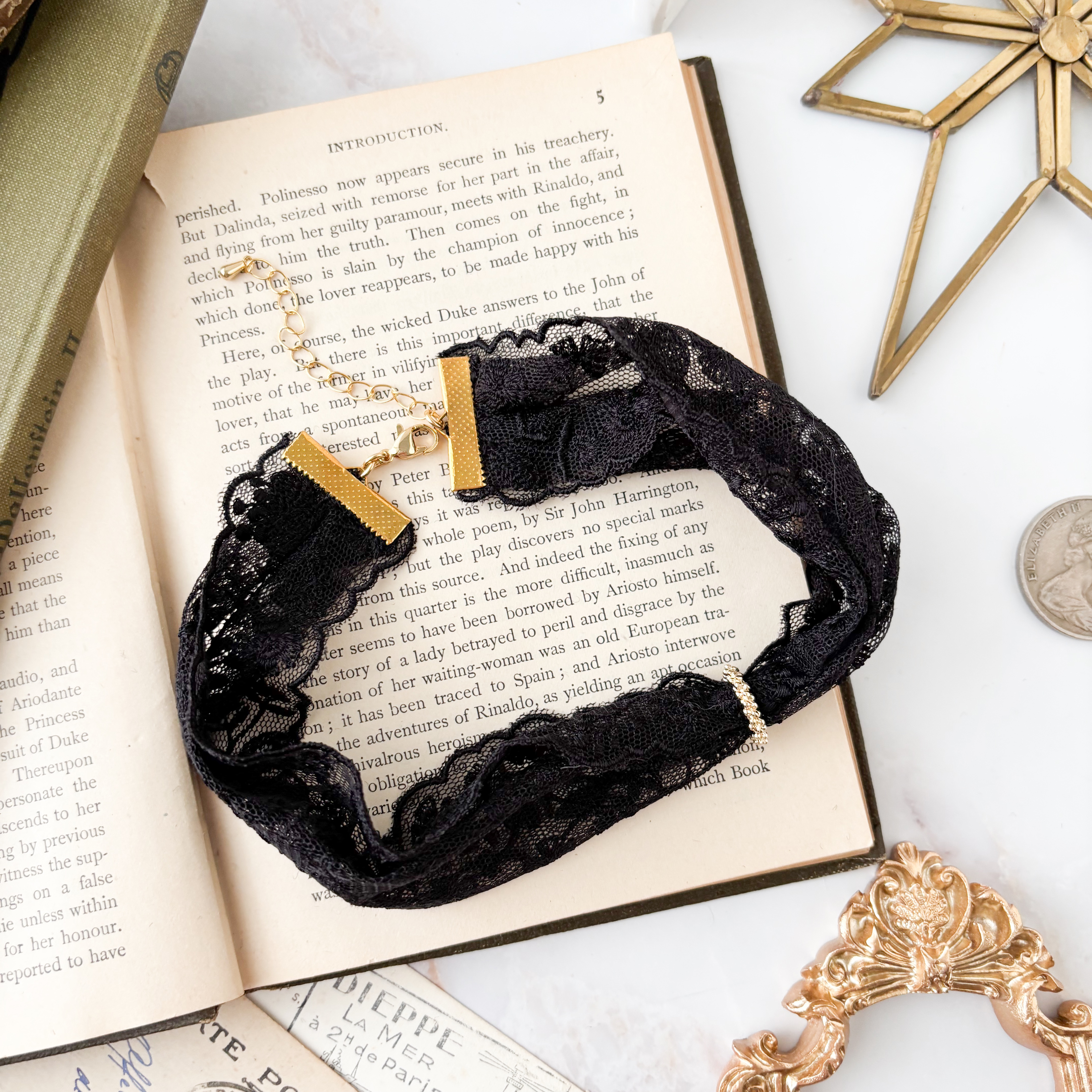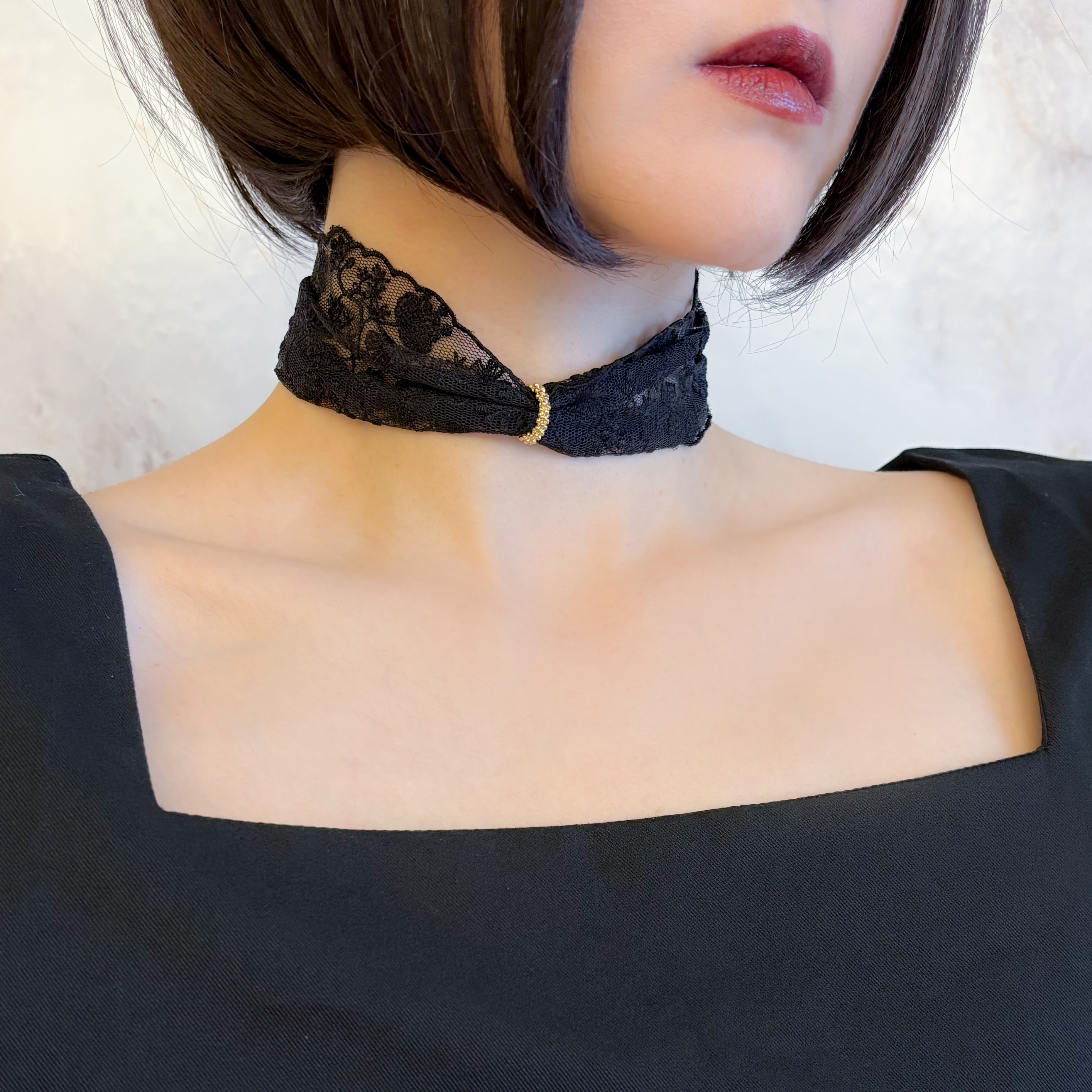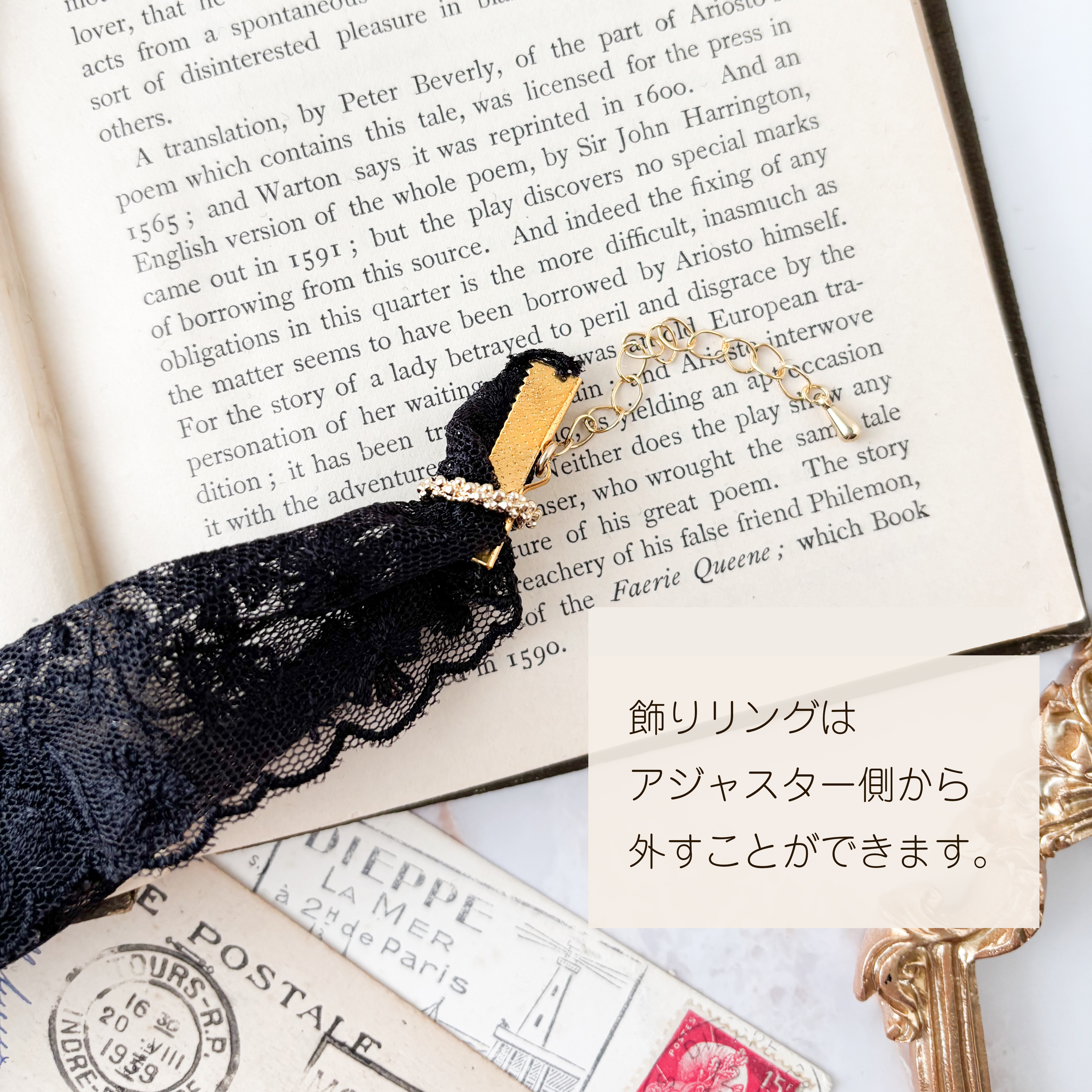 繊細な黒のレースに、さりげなく輝くゴールドのリングを通して、