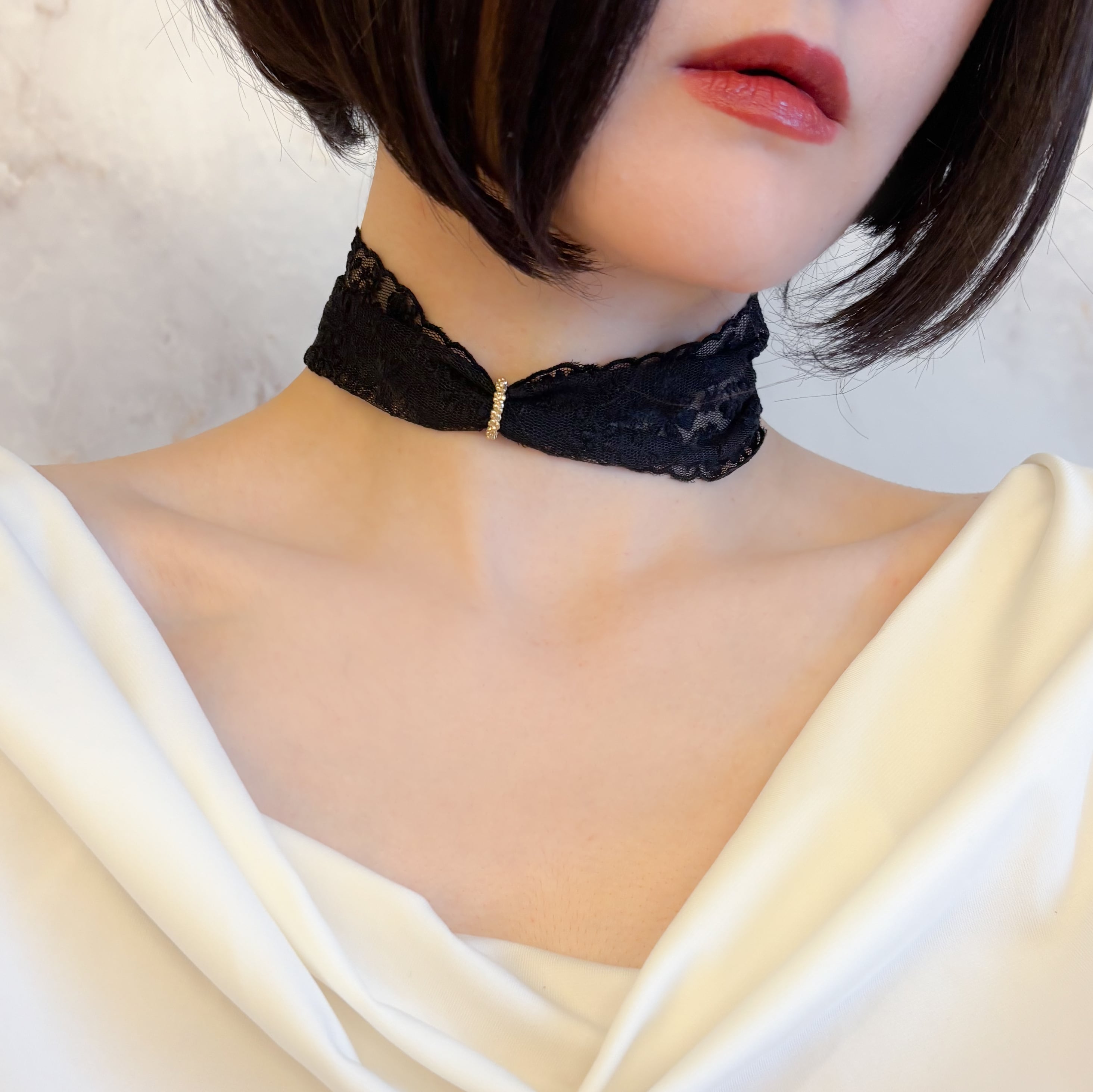 飾りのリングを外してレースを広げれば、ドレスの襟元のようにエレガントに。