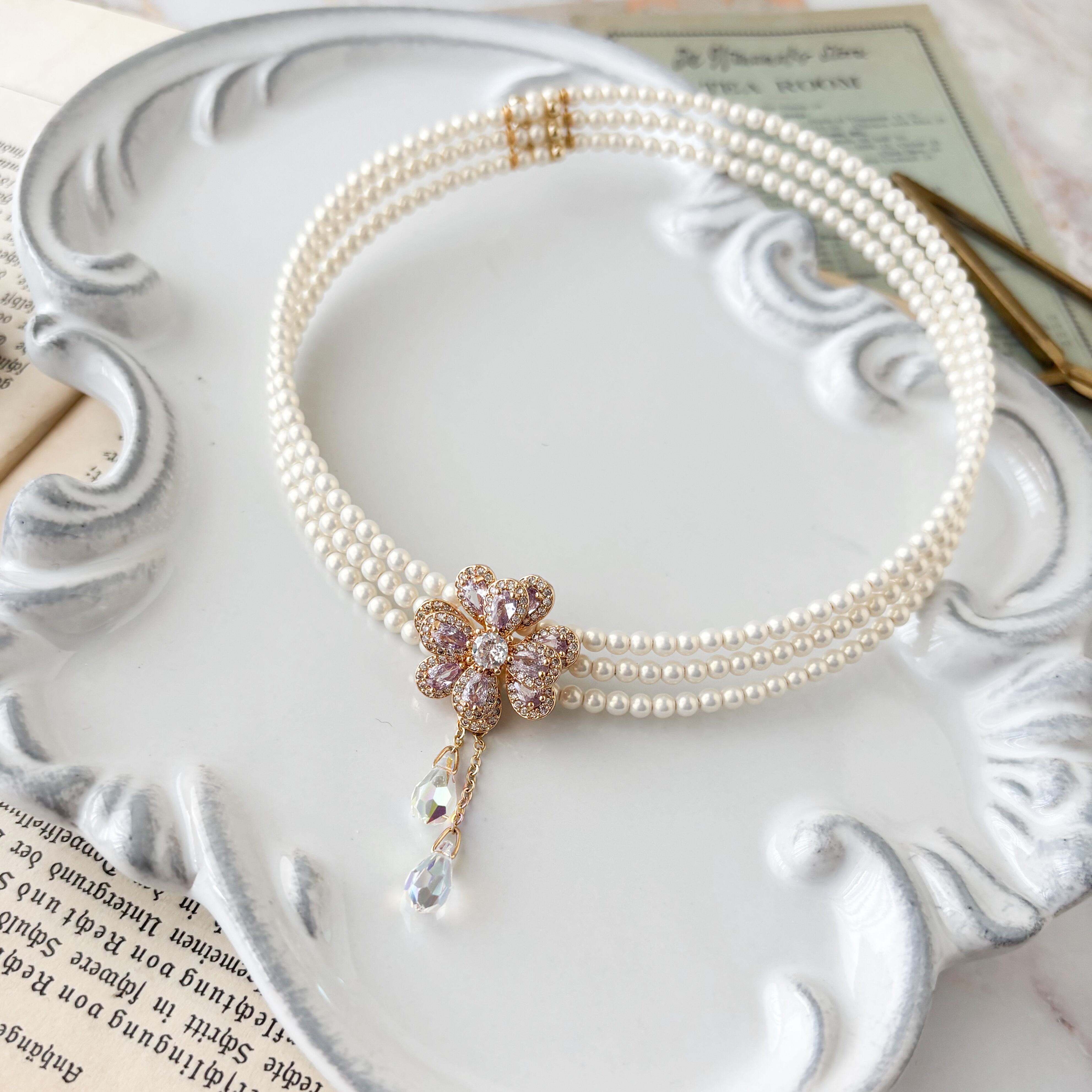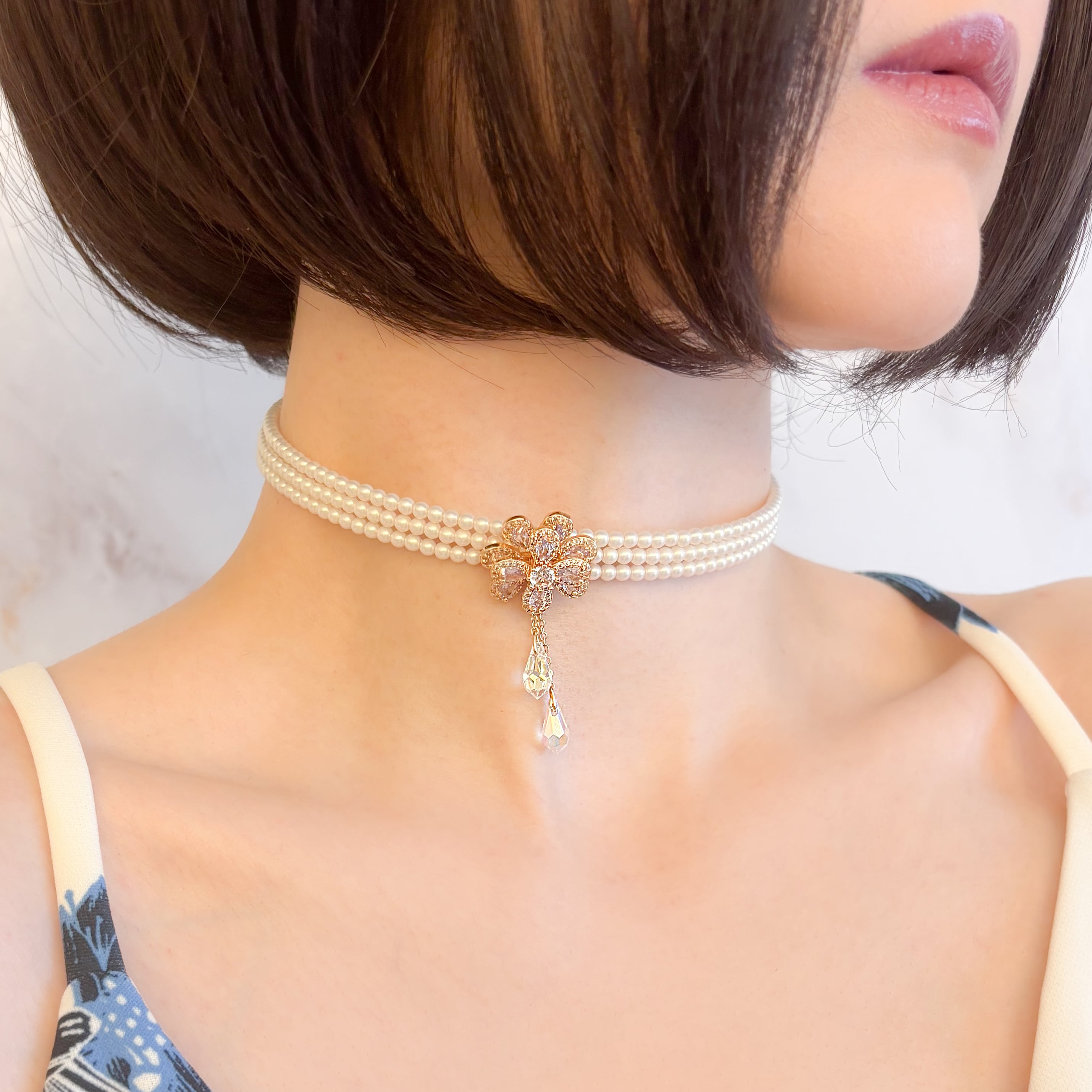 柔らかな色合いのプラスチックパールと大ぶりのカメリアチャームにクリスタルガラスを合わせ、3連のワイヤーチョーカーに仕立てました。
