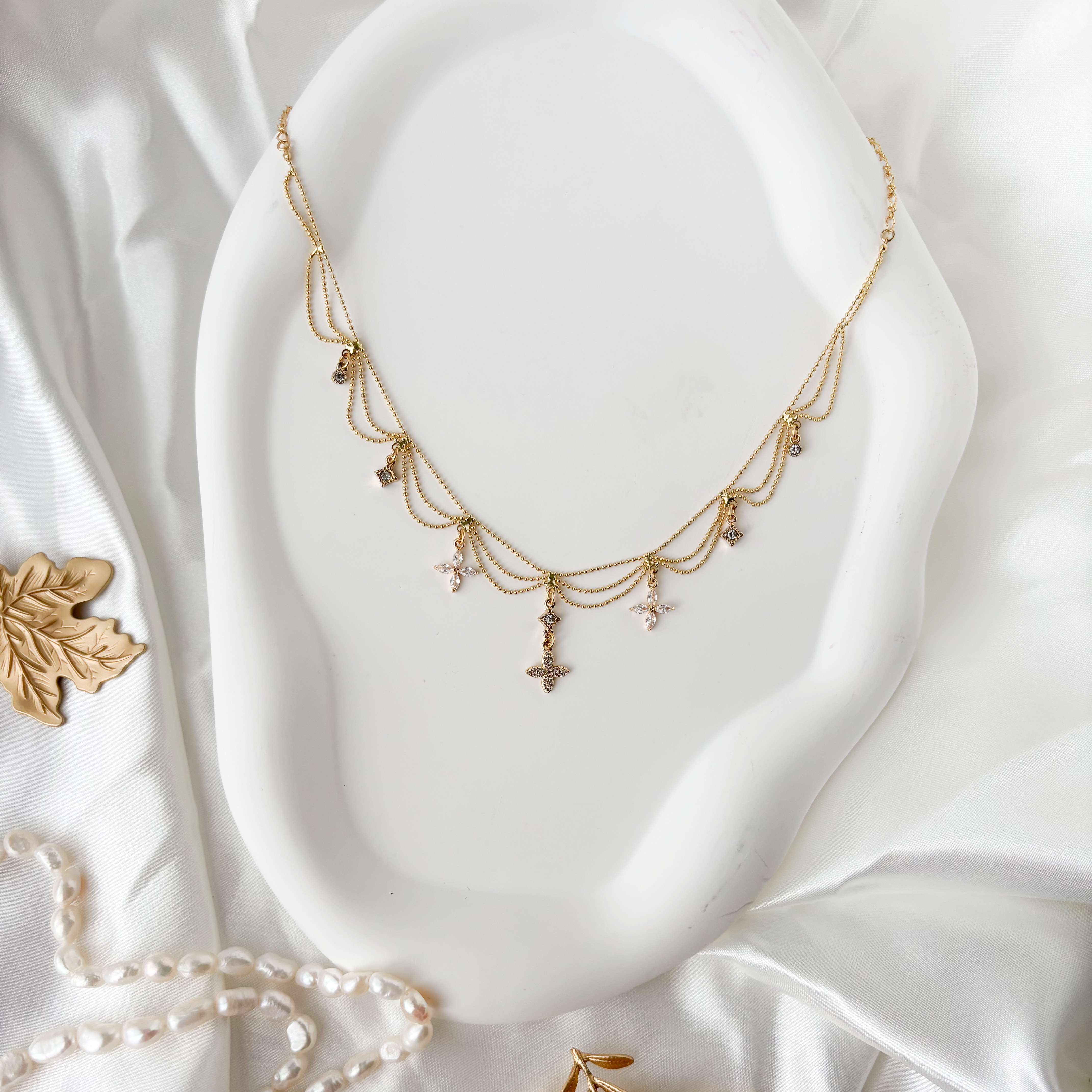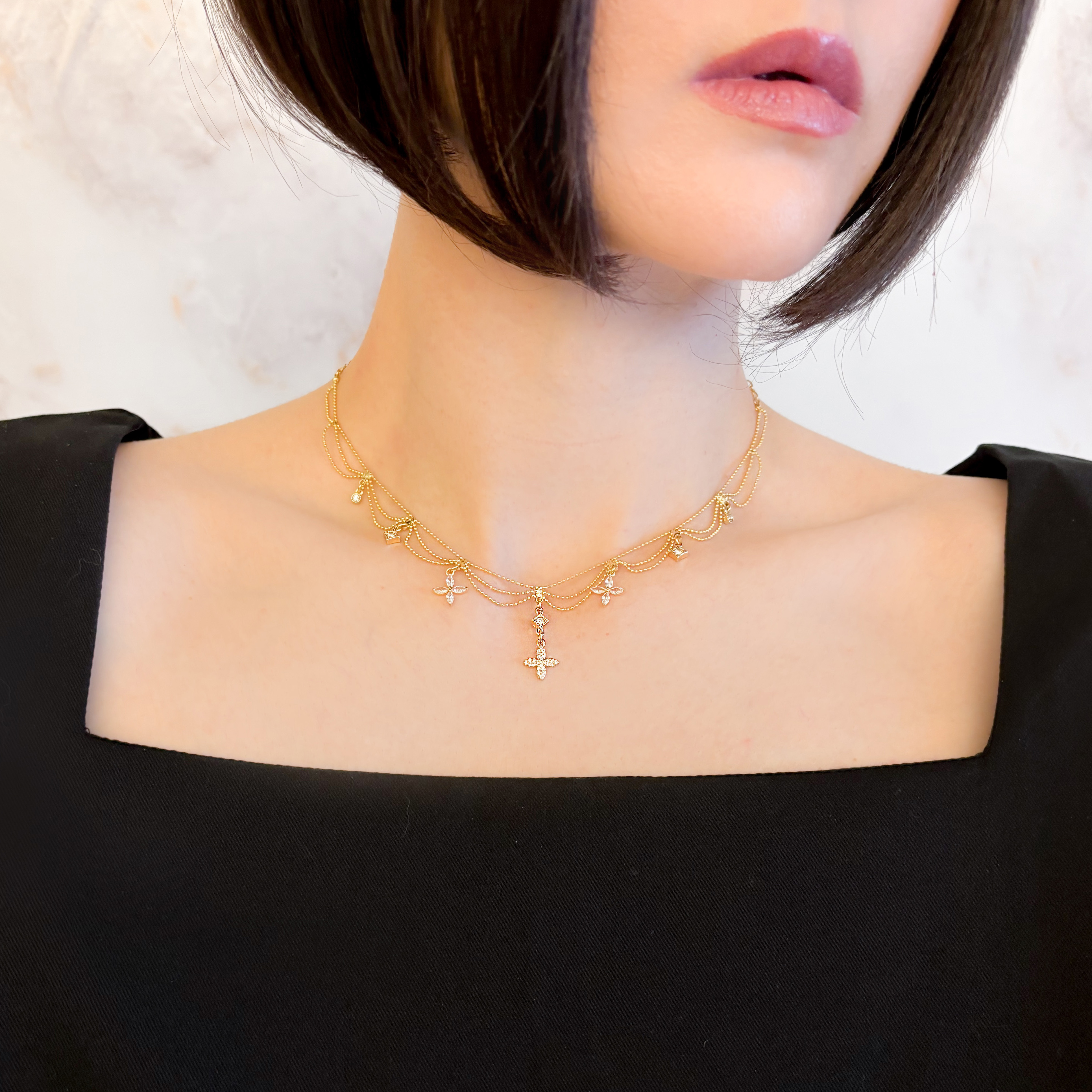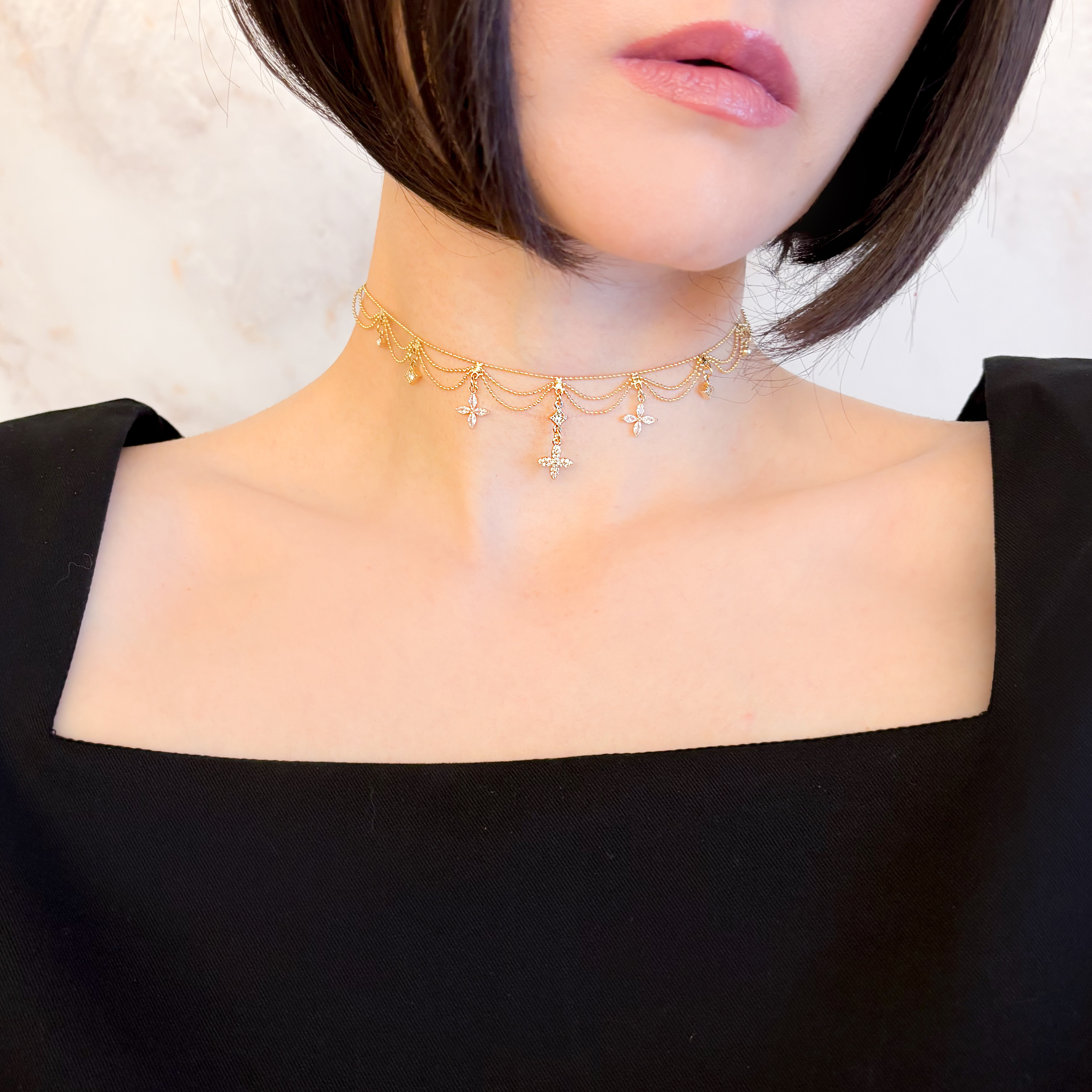 短くチョーカーとして纏えば、きらめきが小さなシャンデリアのように灯り、
