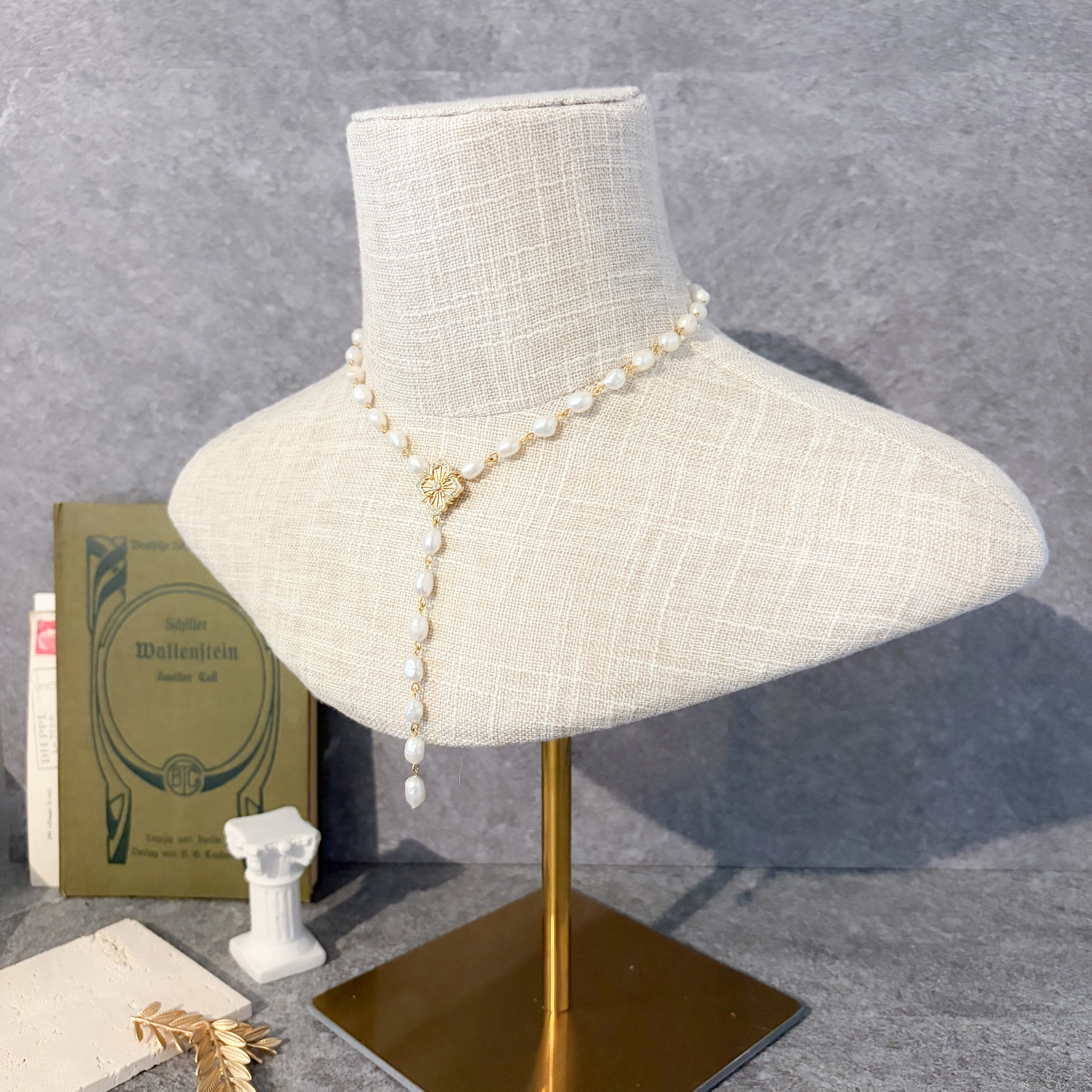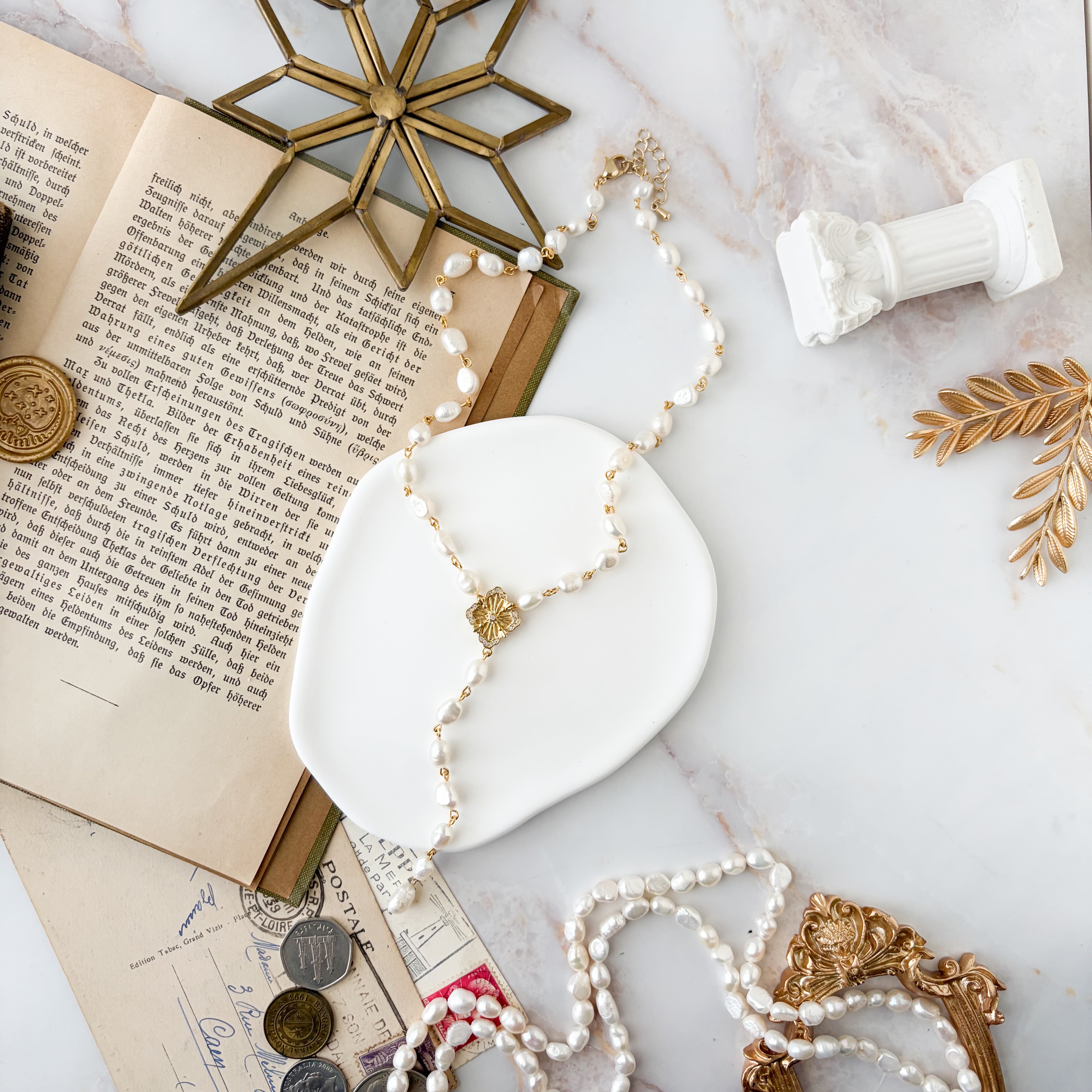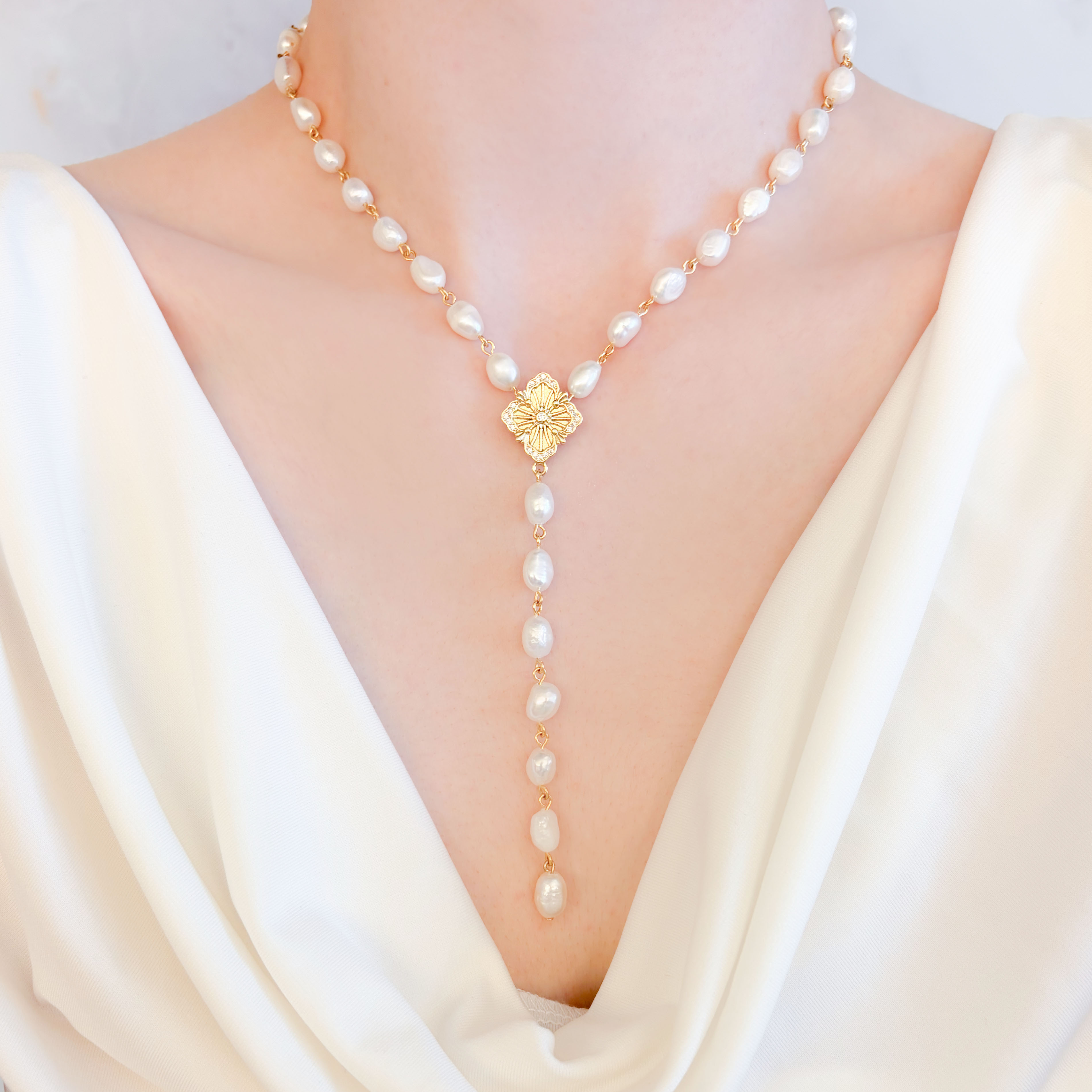 そこから連なる淡水パールが、まるで光のしずくのように静かに揺れます。