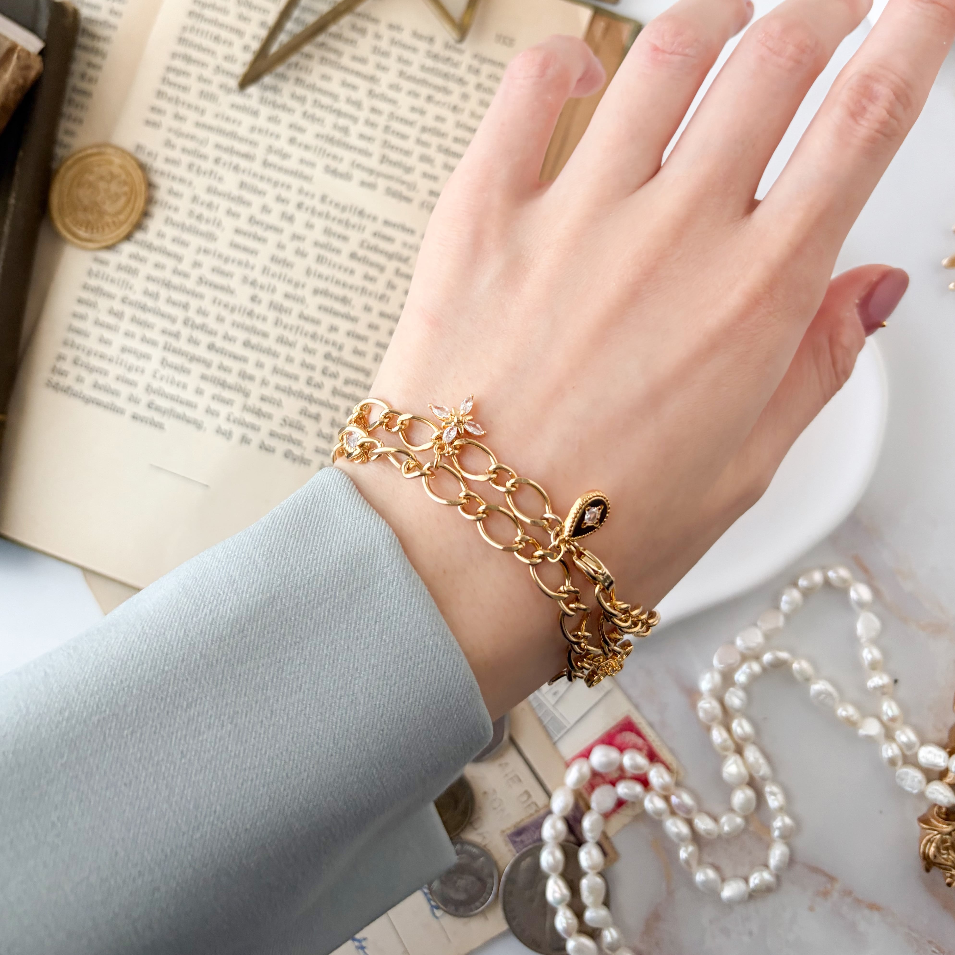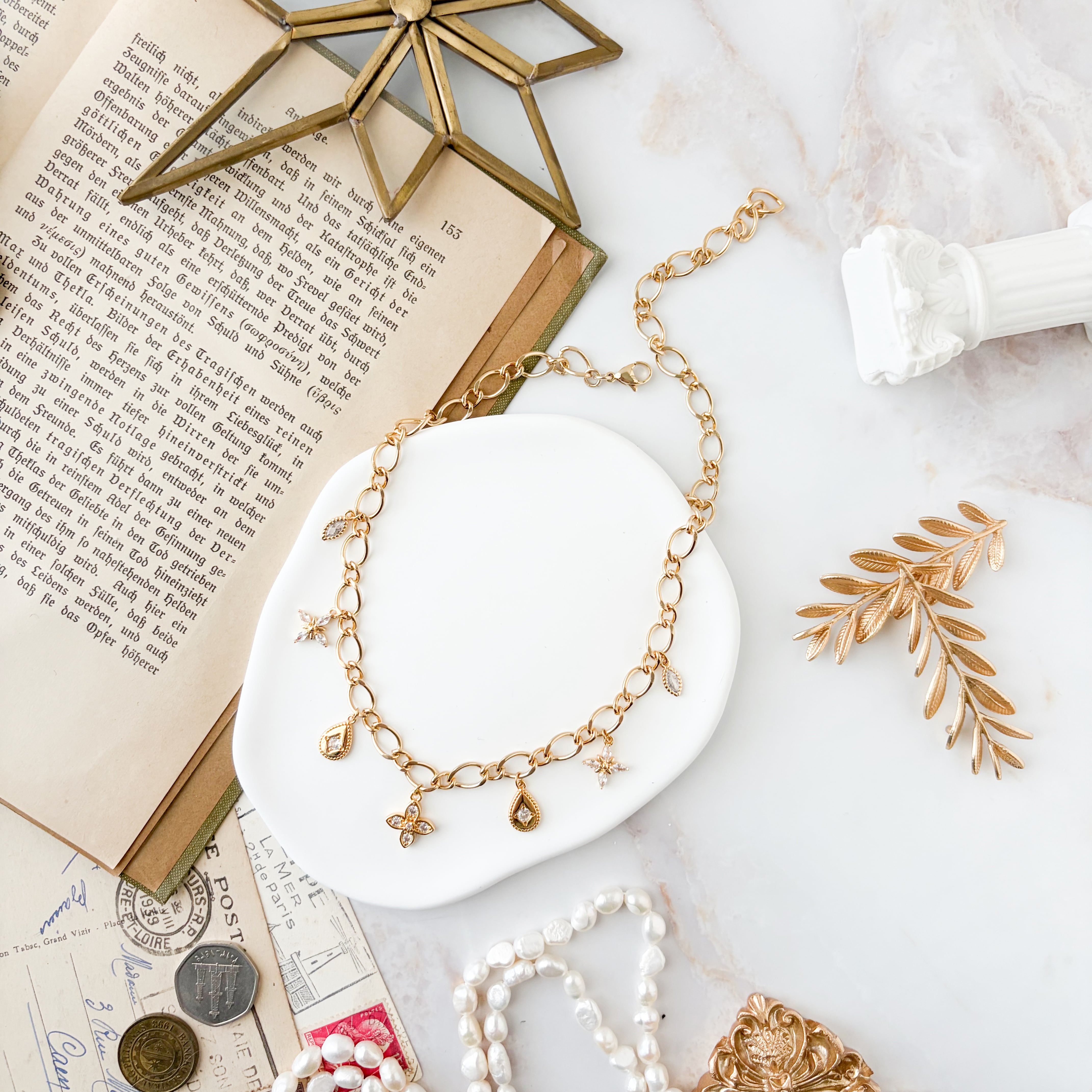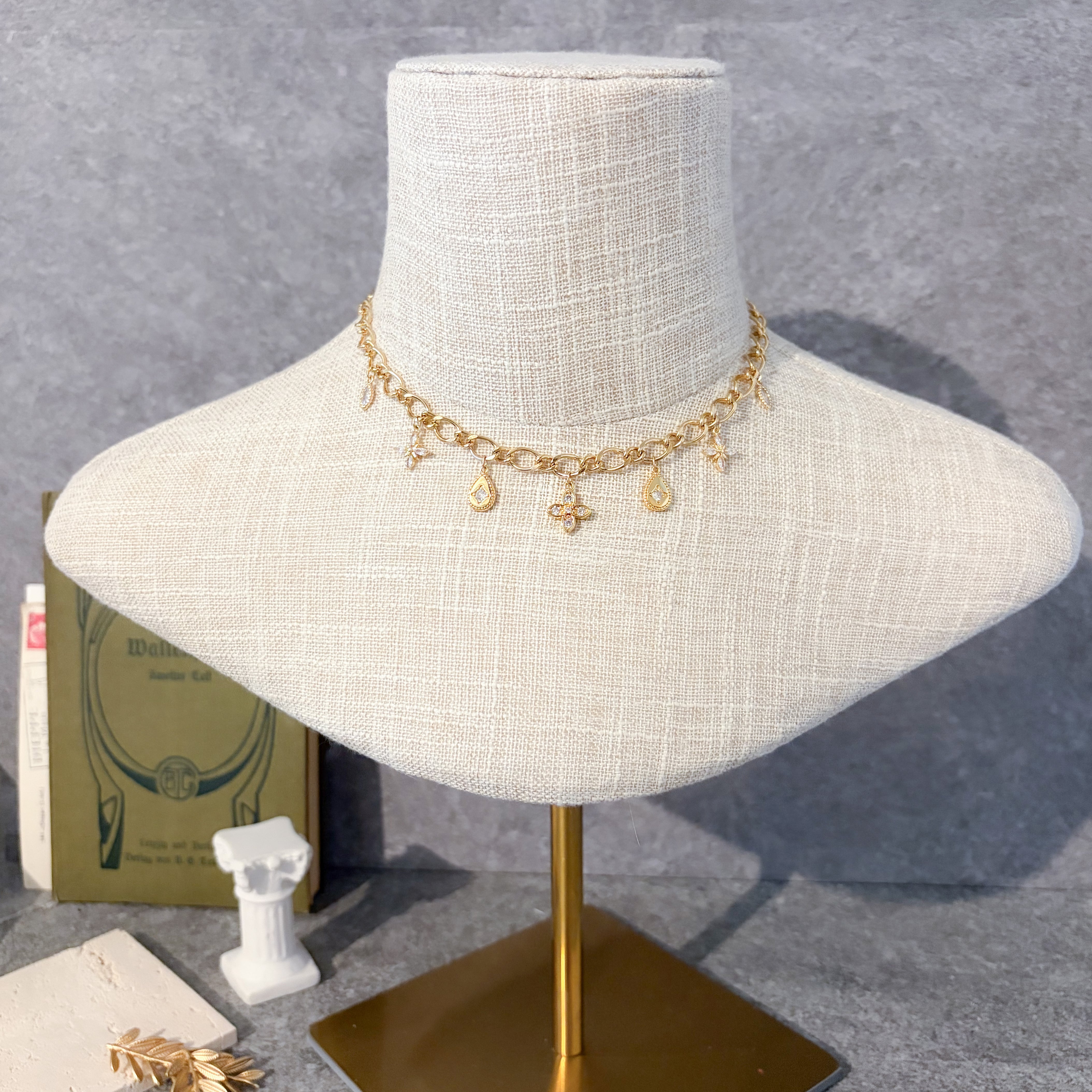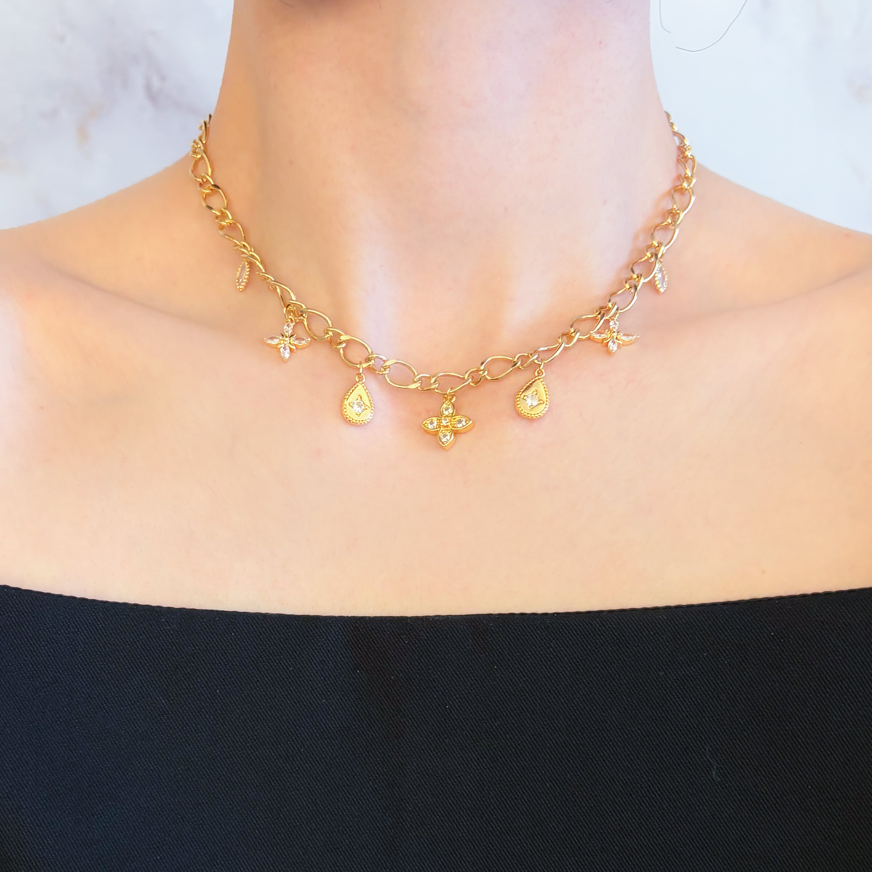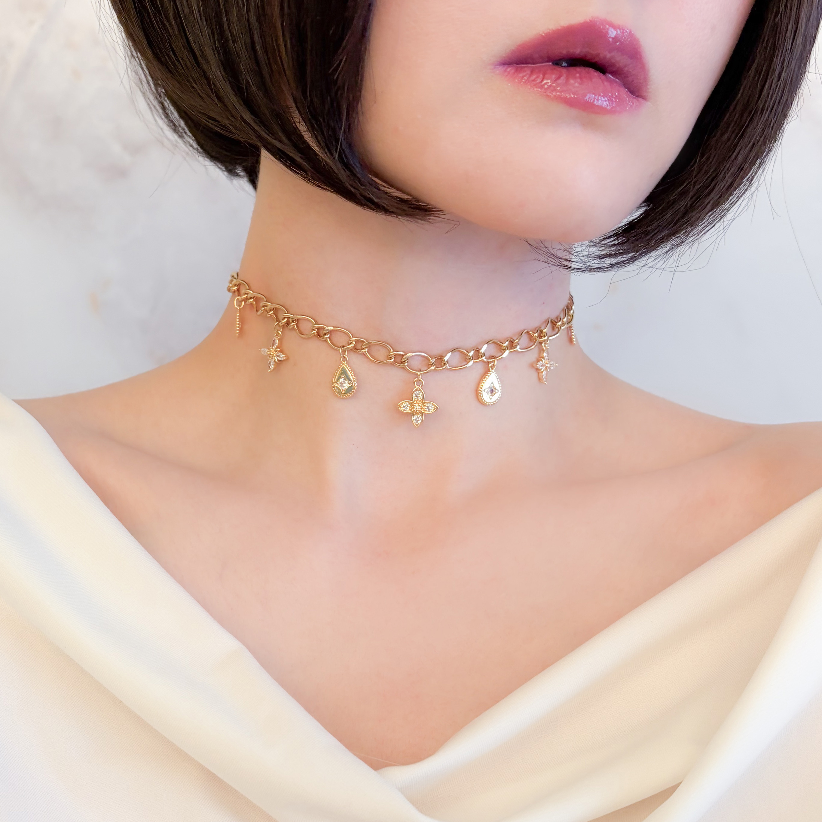存在感のあるのフィガロチェーンに散りばめたのは、小さなクローバーやきらめくチャームたち。