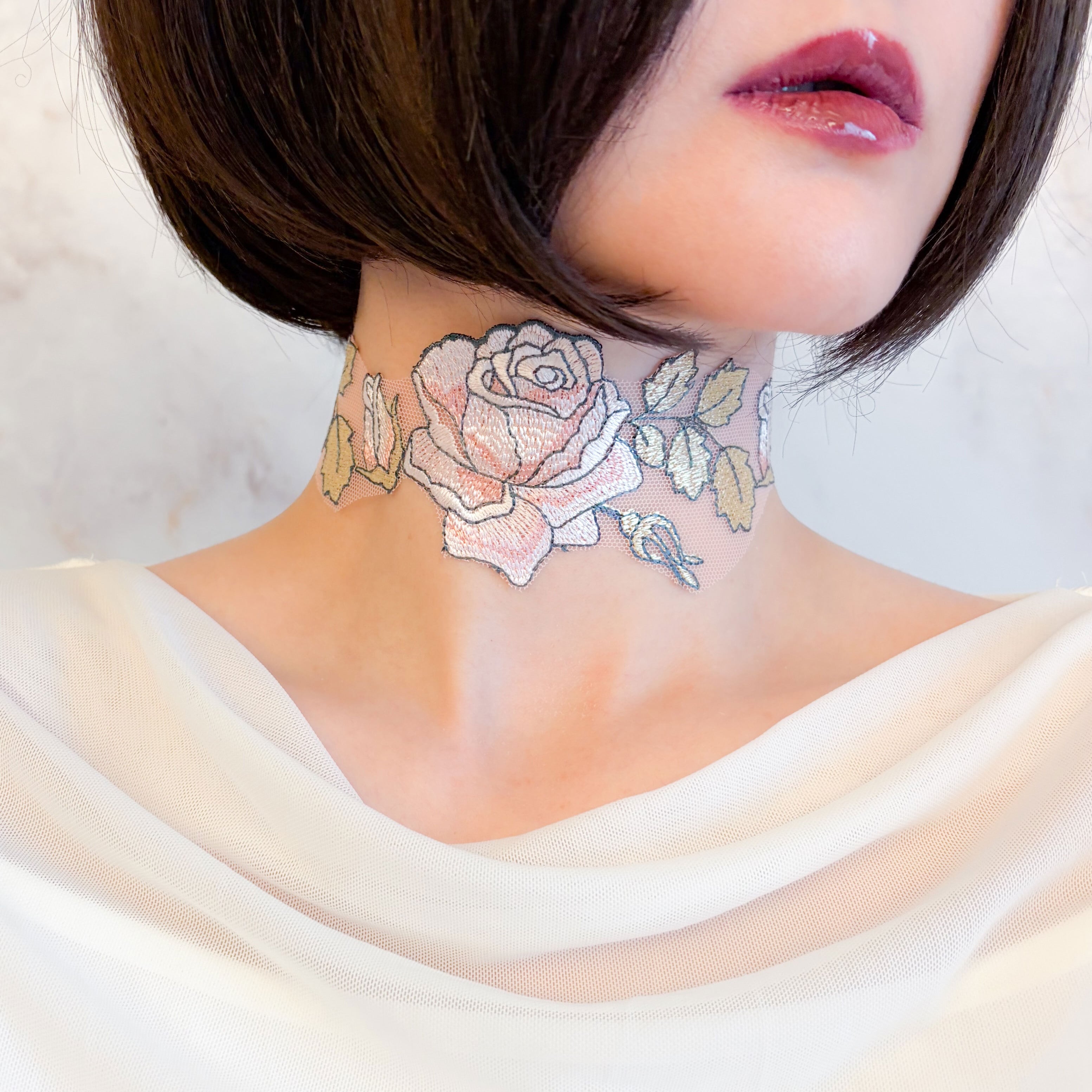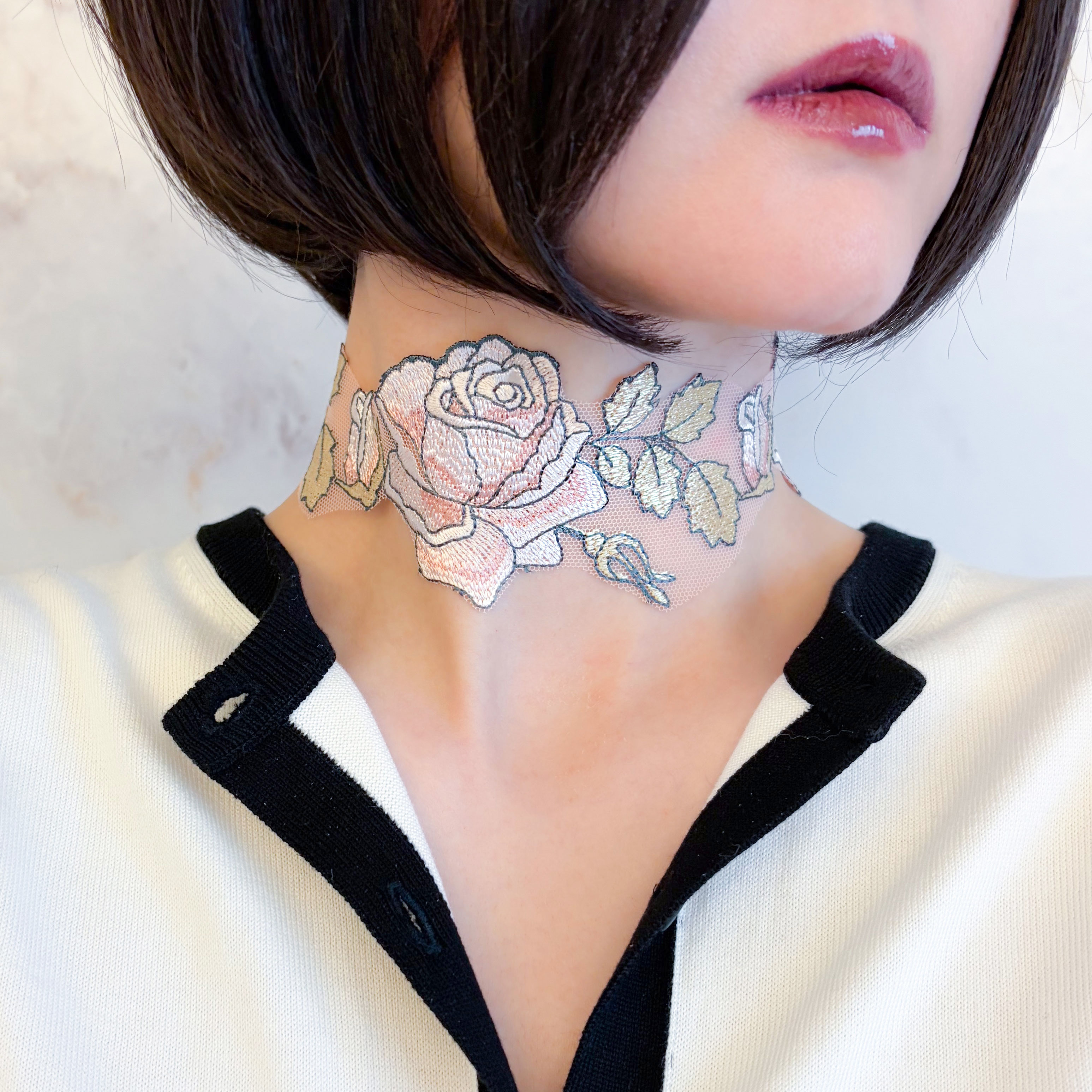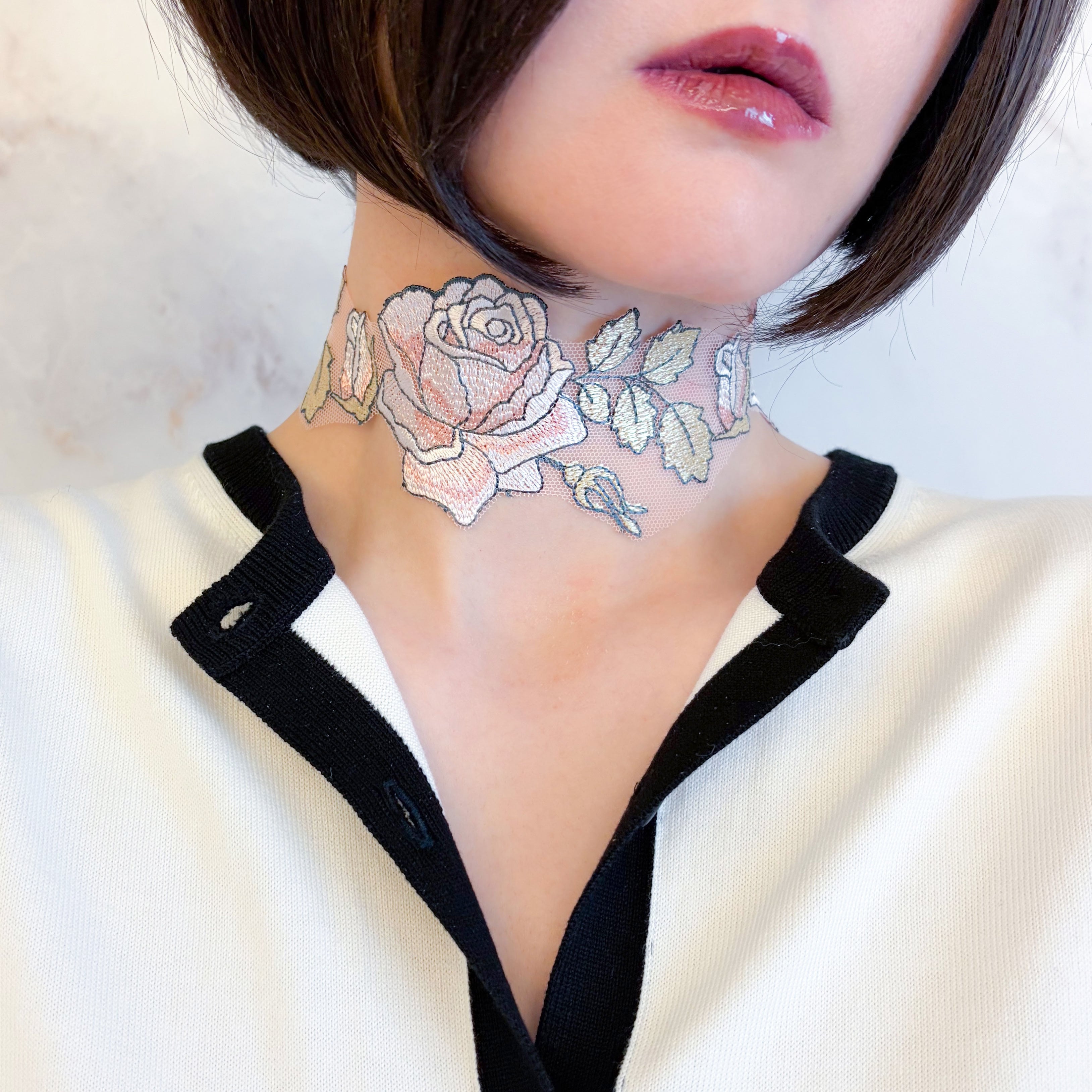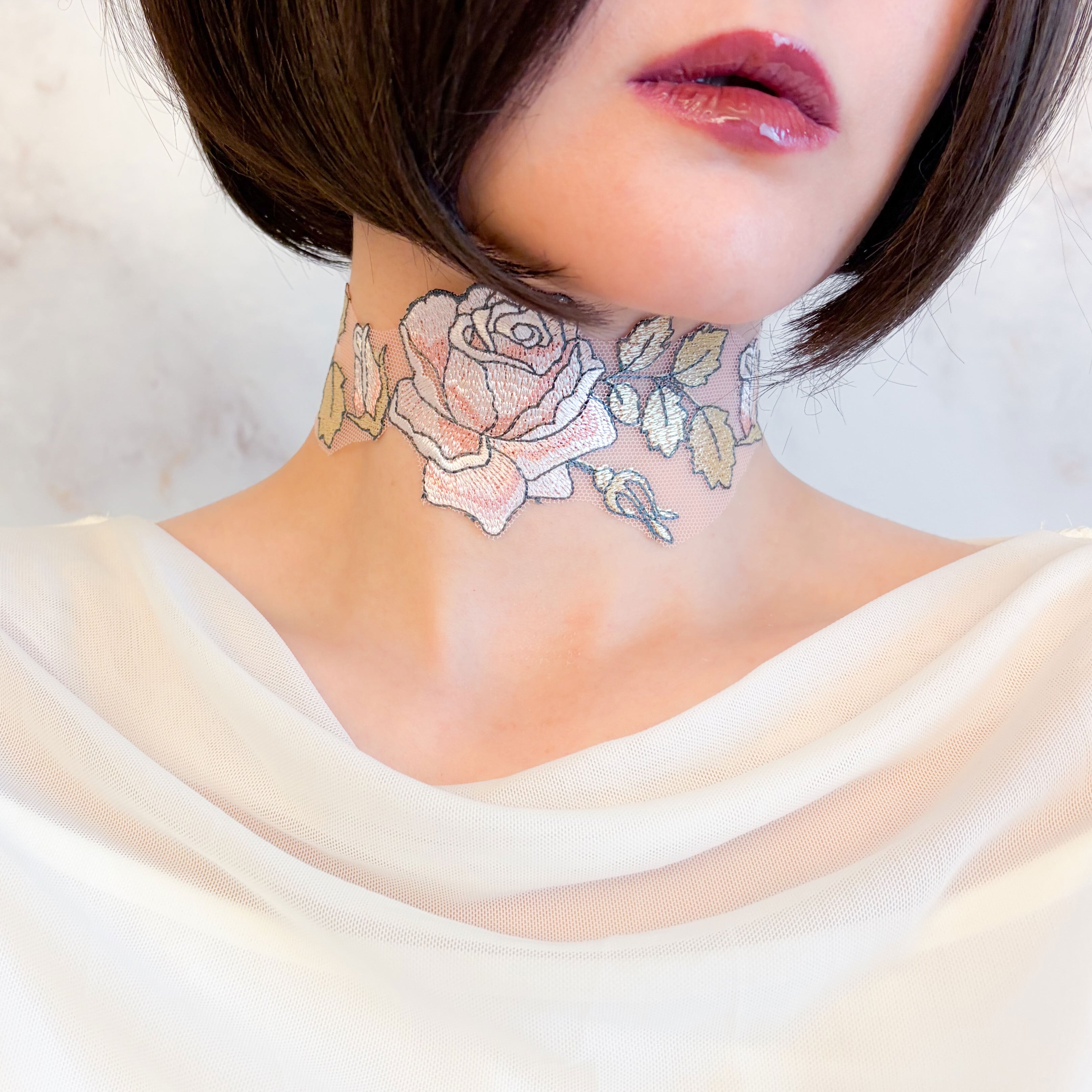 繊細なレースで描かれた薔薇模様は、まるで素肌に溶け込むように首元へ寄り添い、