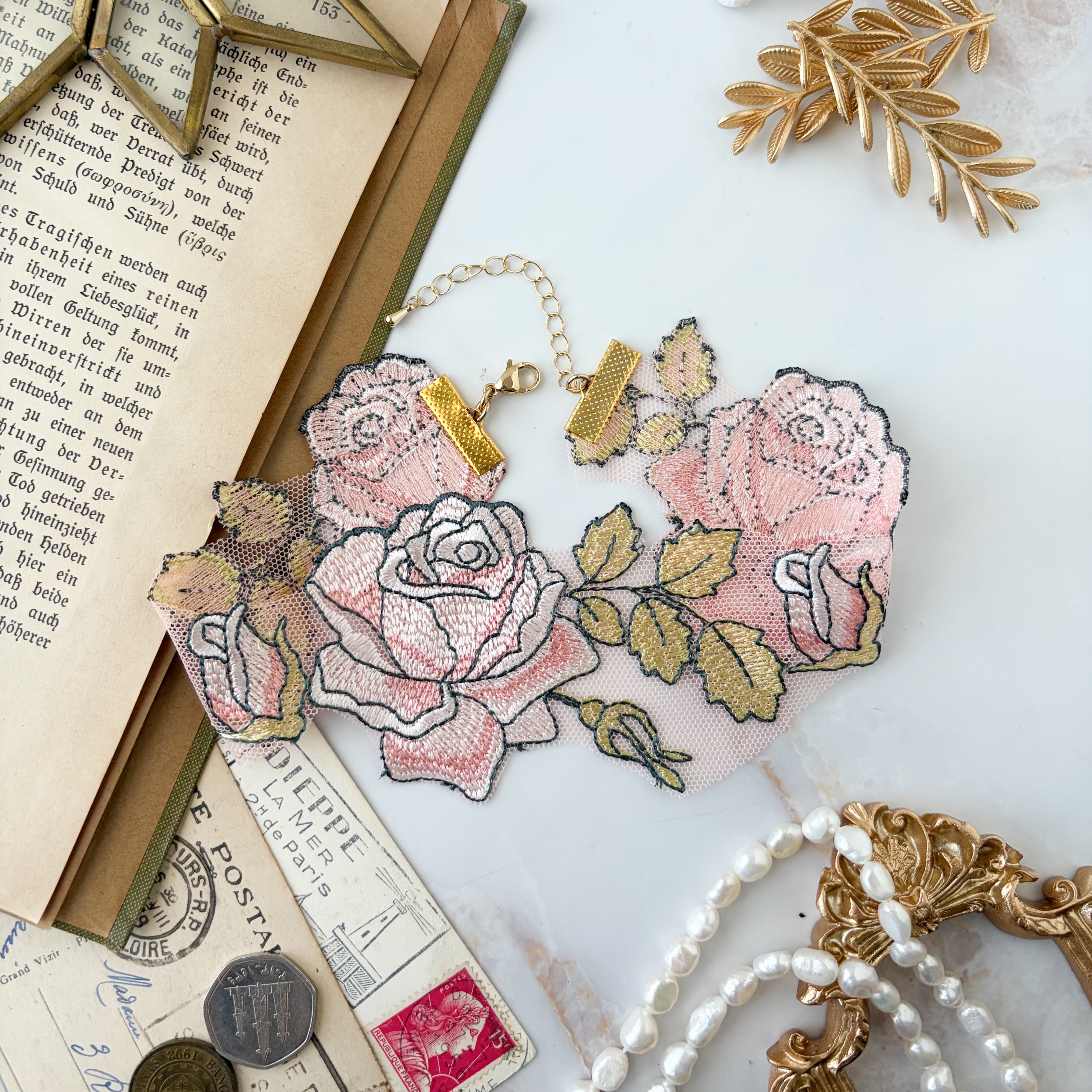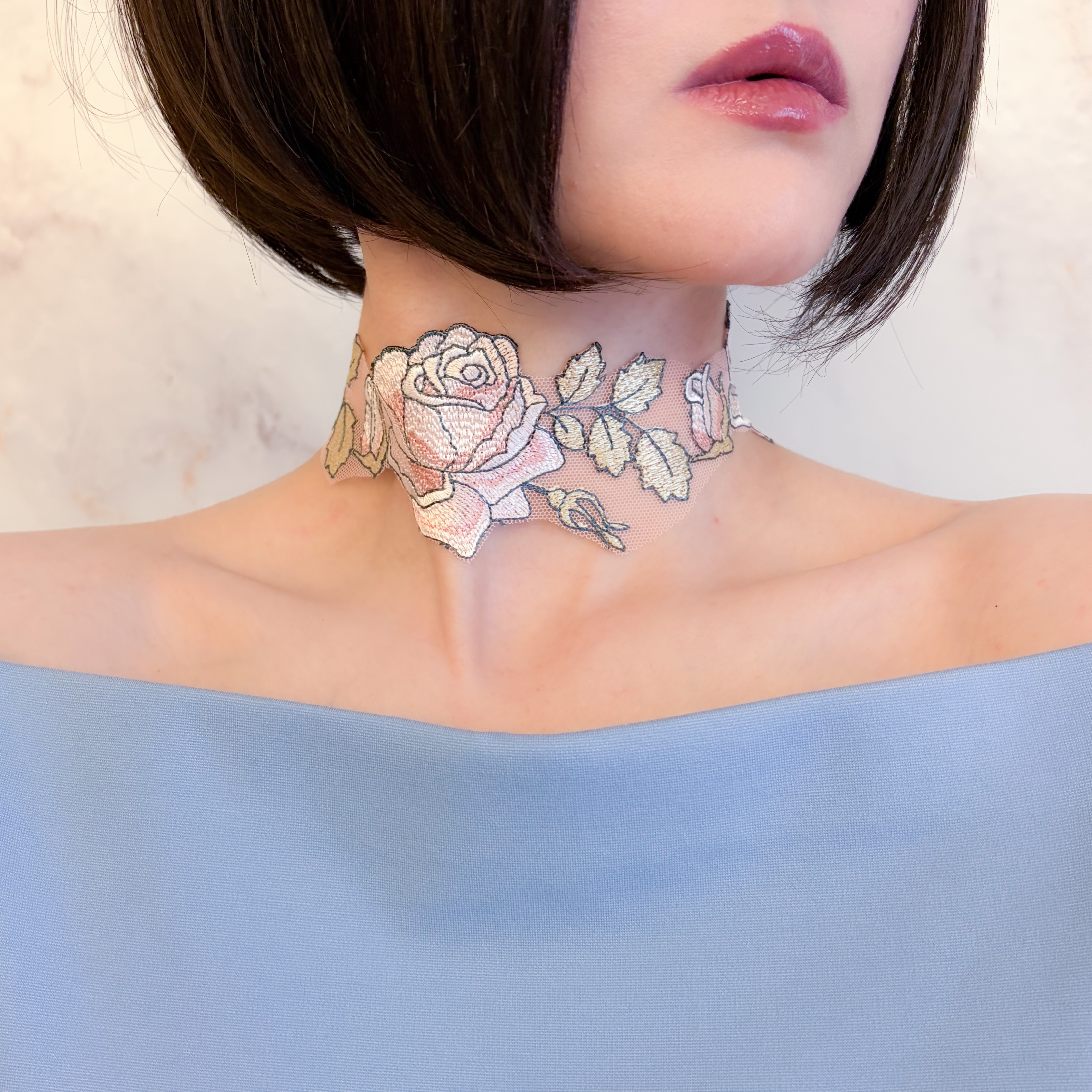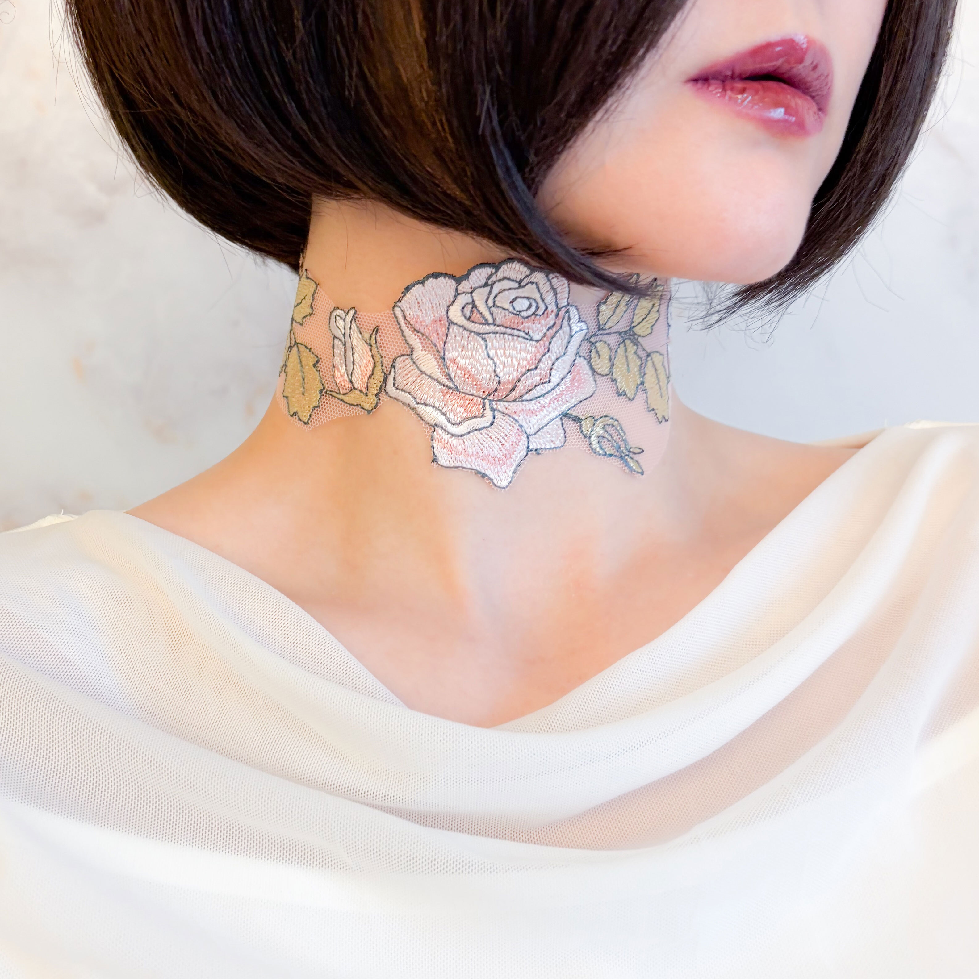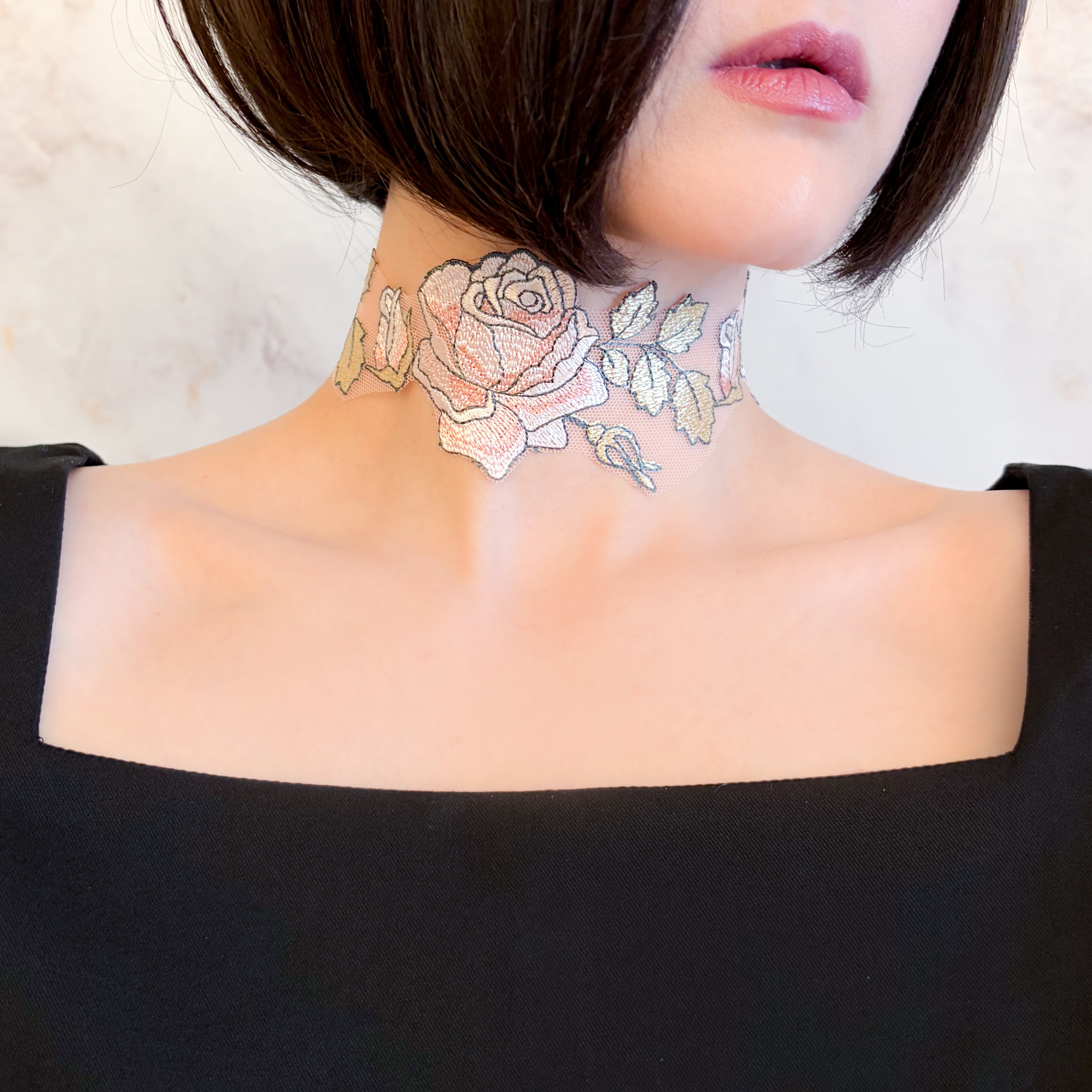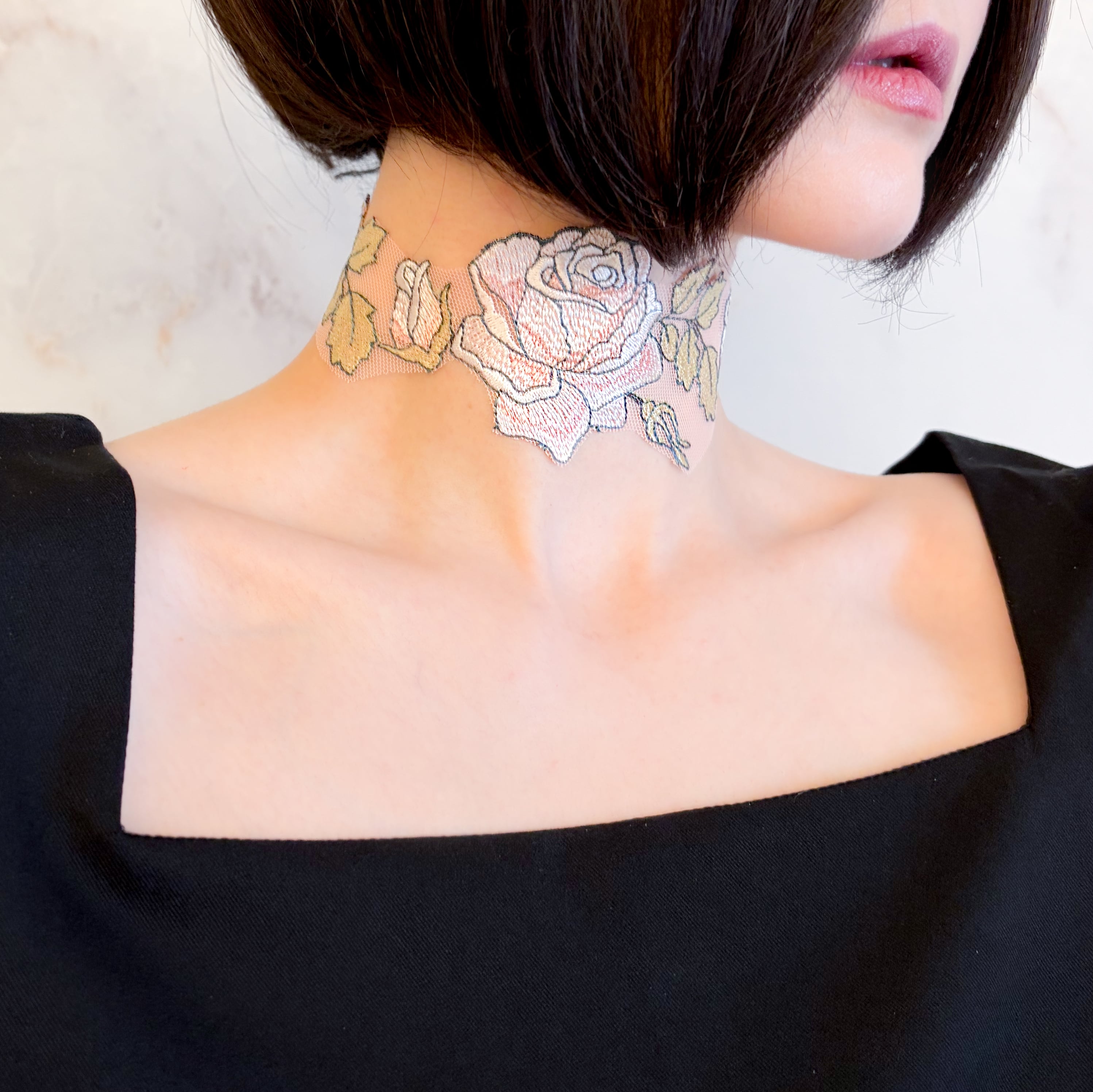 繊細なレースで描かれた薔薇模様は、まるで素肌に溶け込むように首元へ寄り添い、