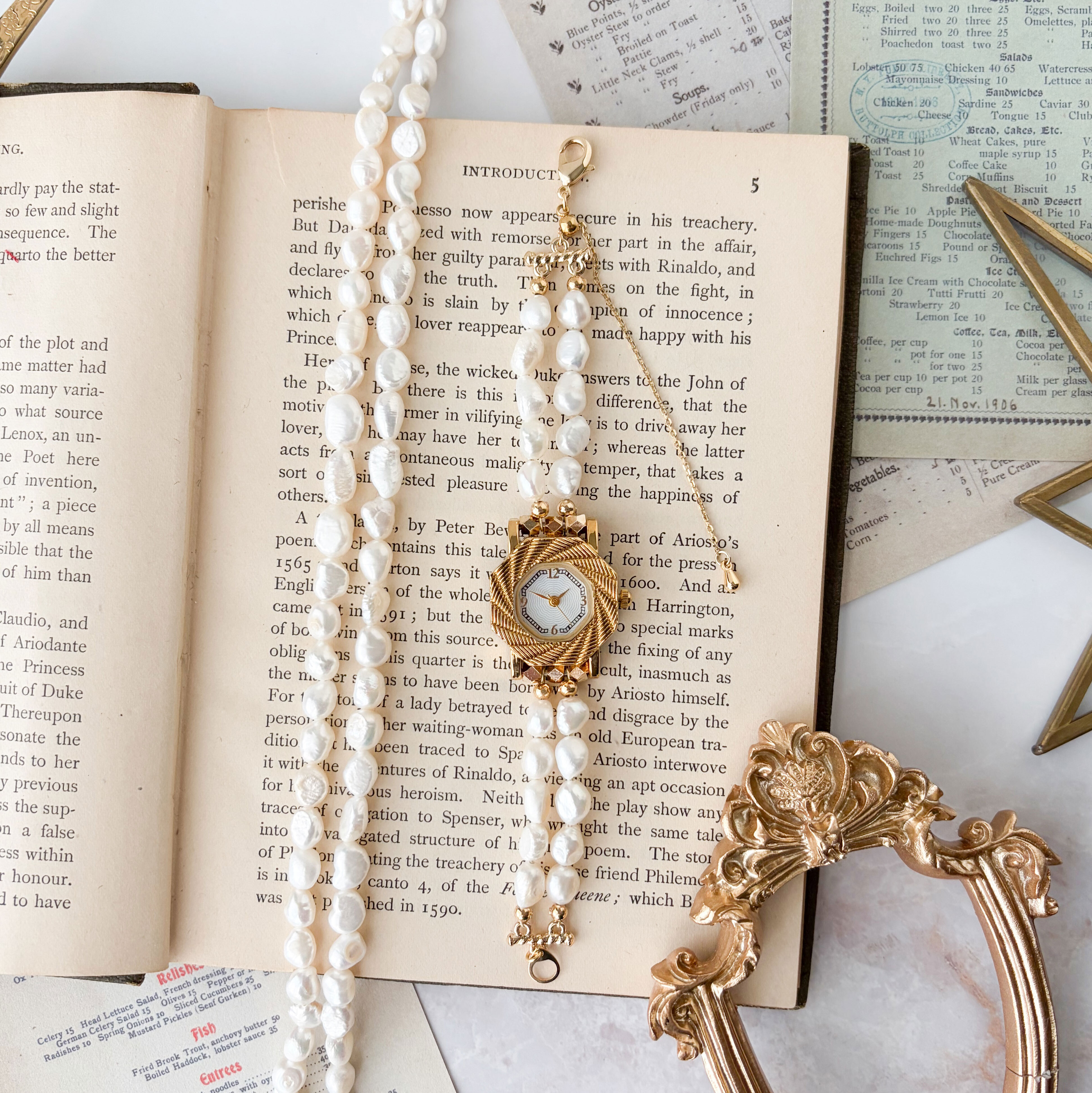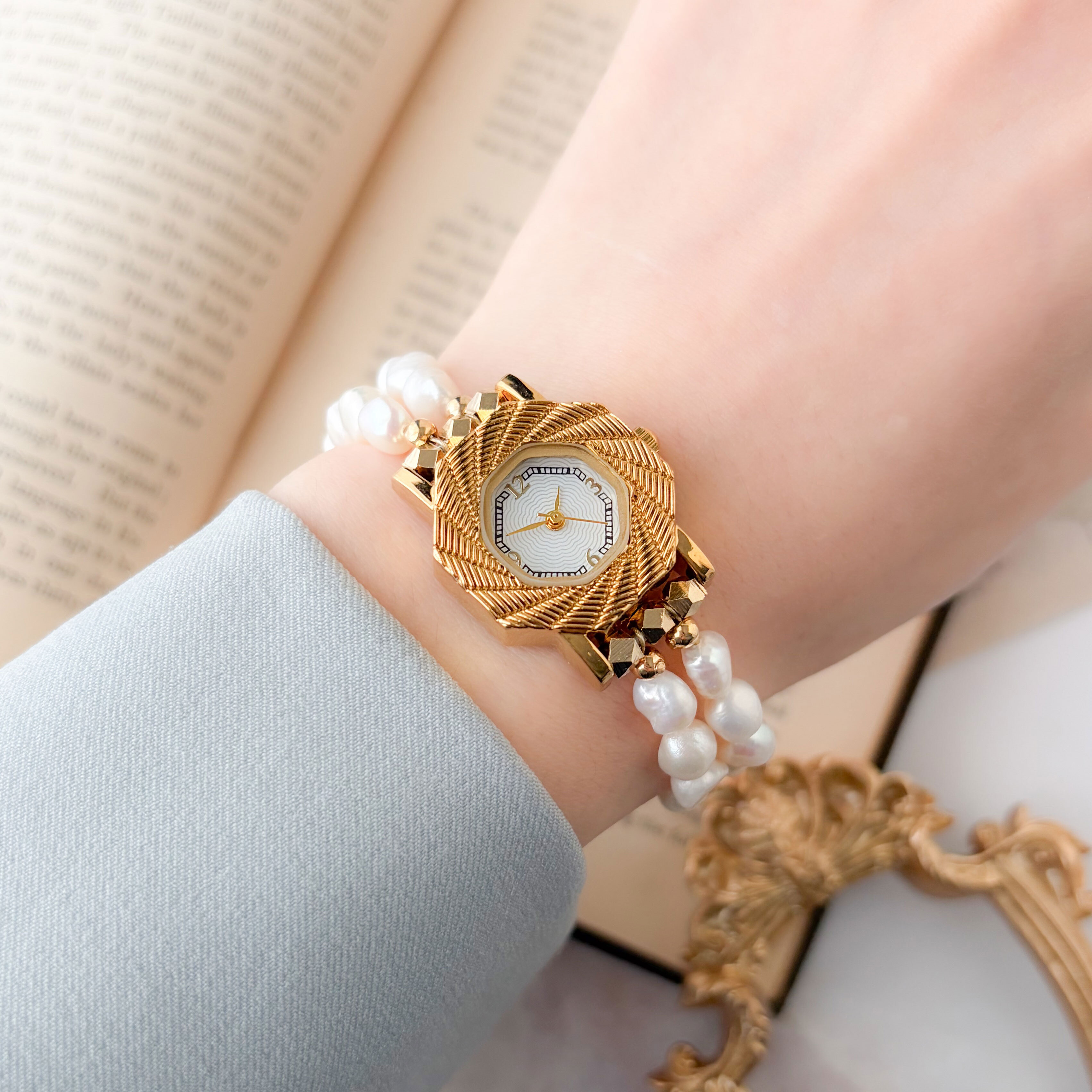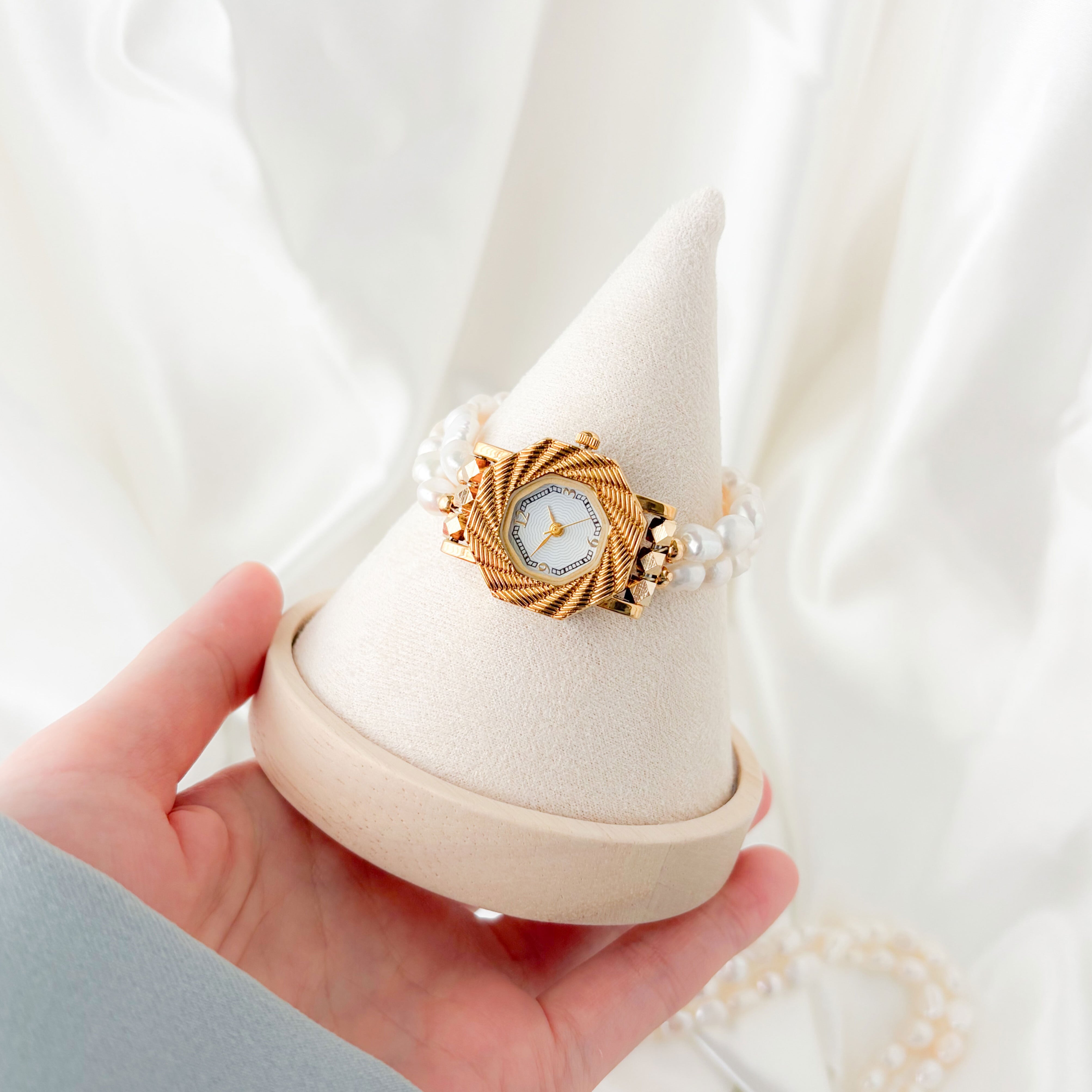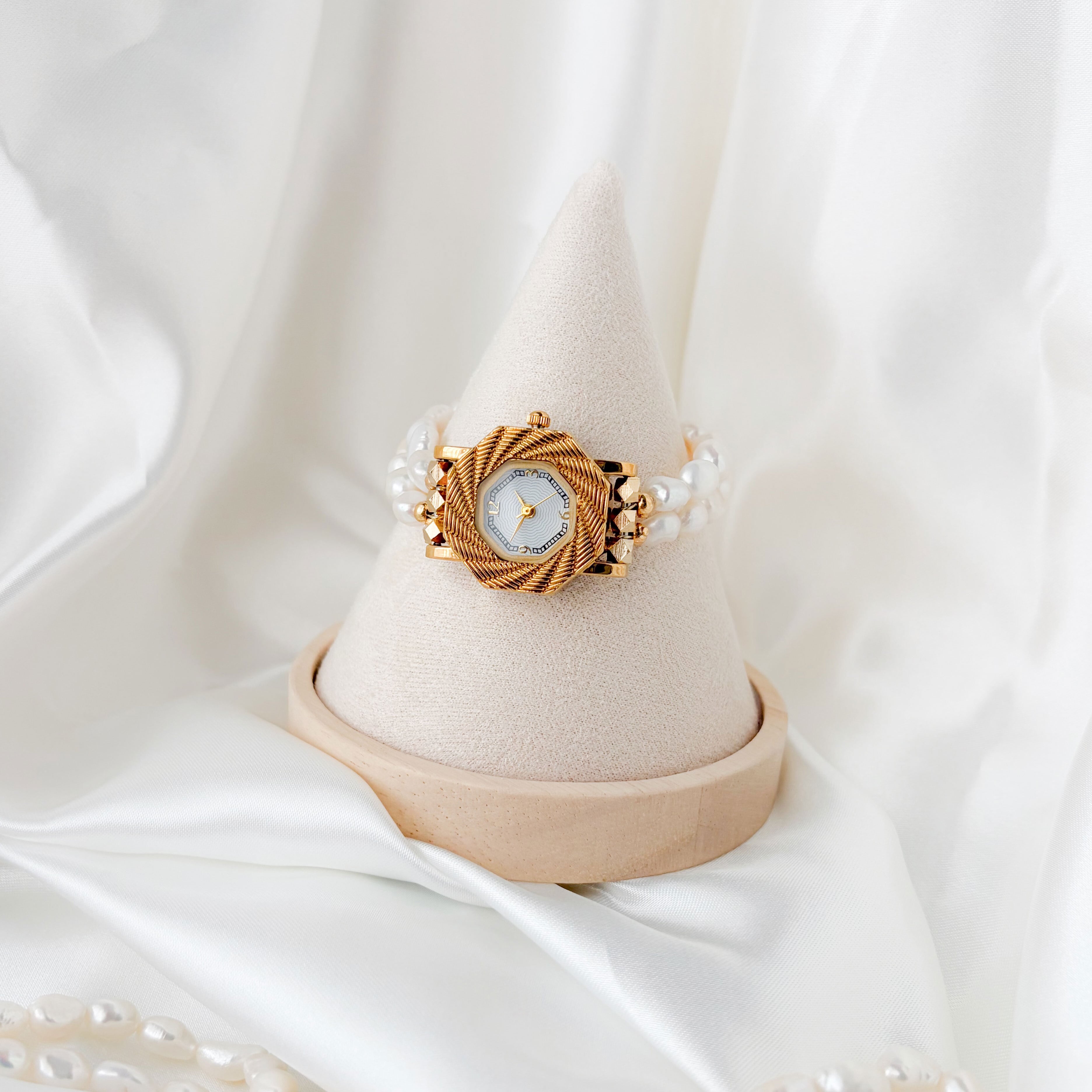 やわらかな光を放つ淡水パールを贅沢にあしらったブレスレットウォッチ。