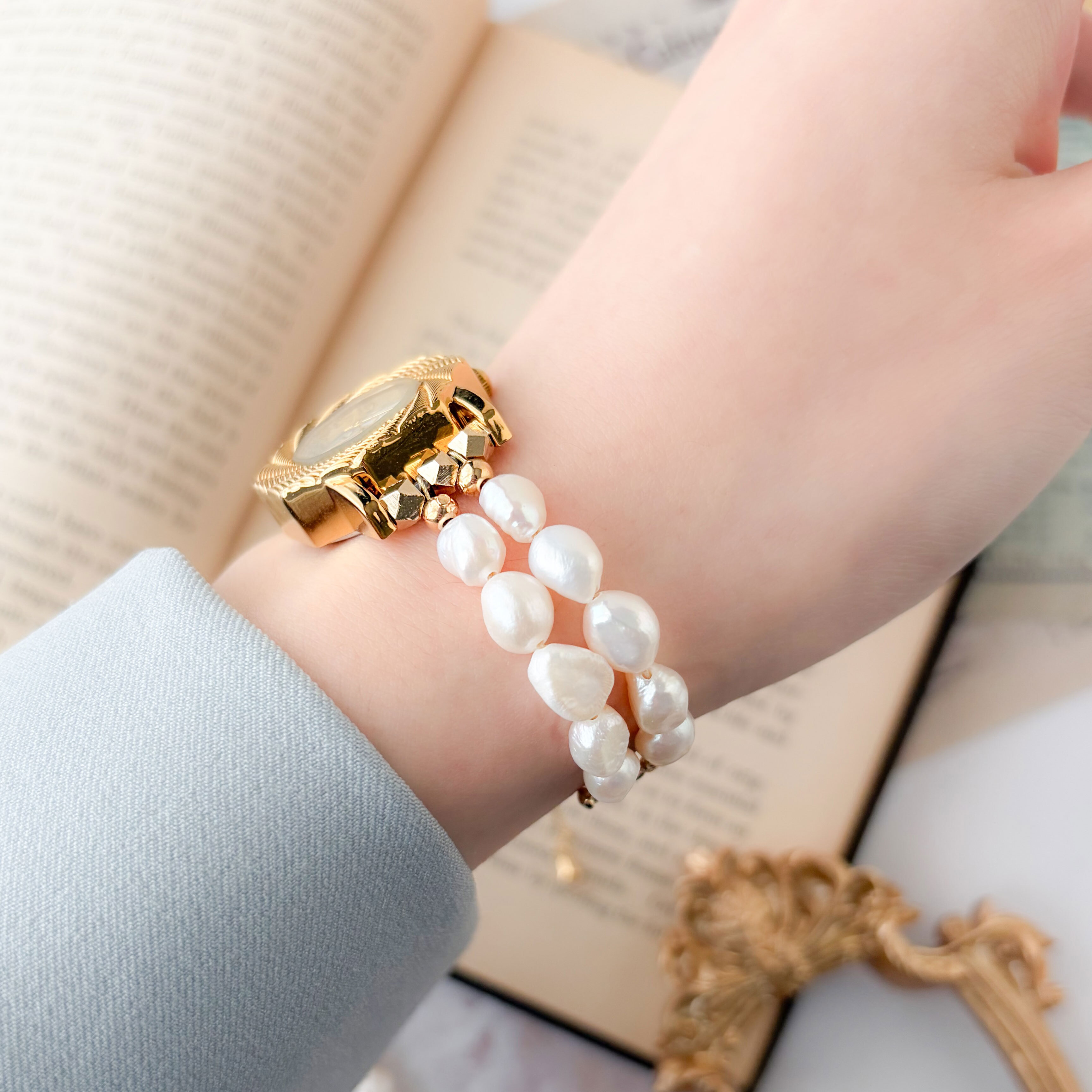 2連に仕立てたパールが、手首に優しく寄り添いながら