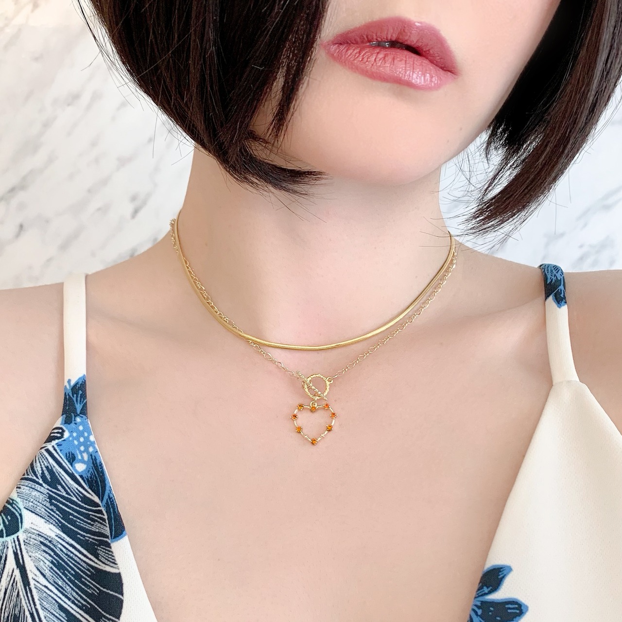 美しいハートのチャームに目を奪われて、シンプルでロマンチックなマンテルネックレスに仕立てました。