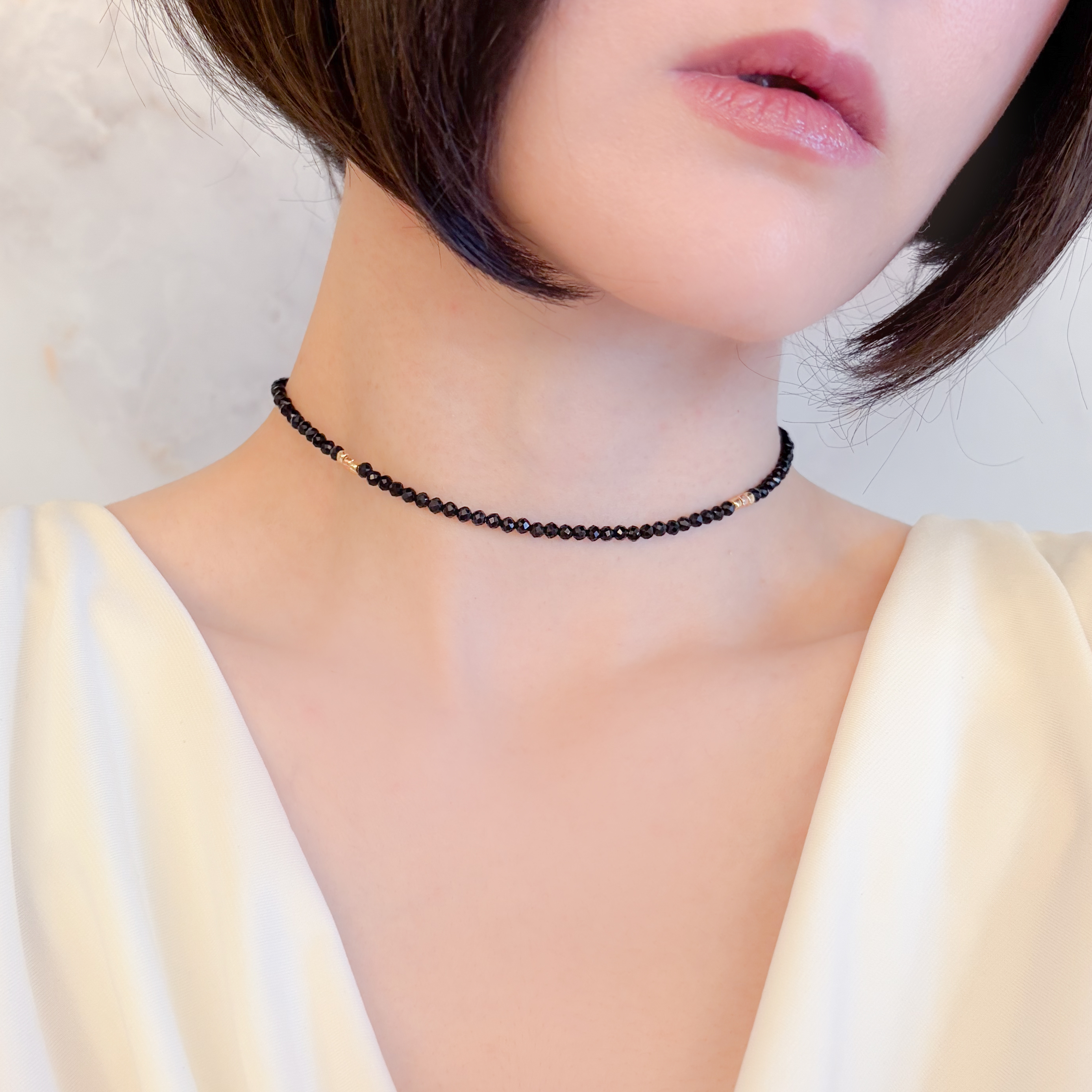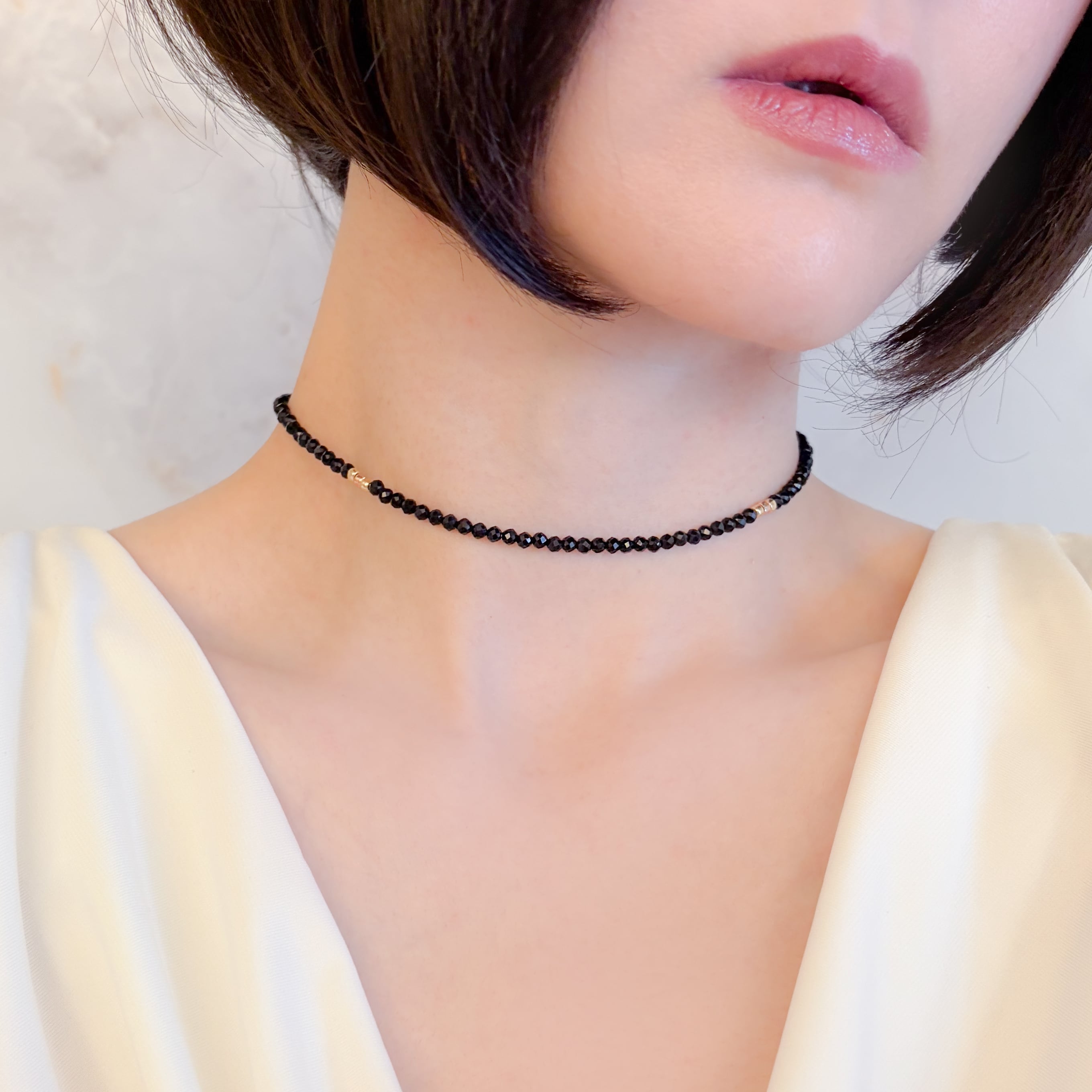 ラウンドカットが施された天然石オニキスを、繊細に連ねたシンプルなチョーカーネックレス。