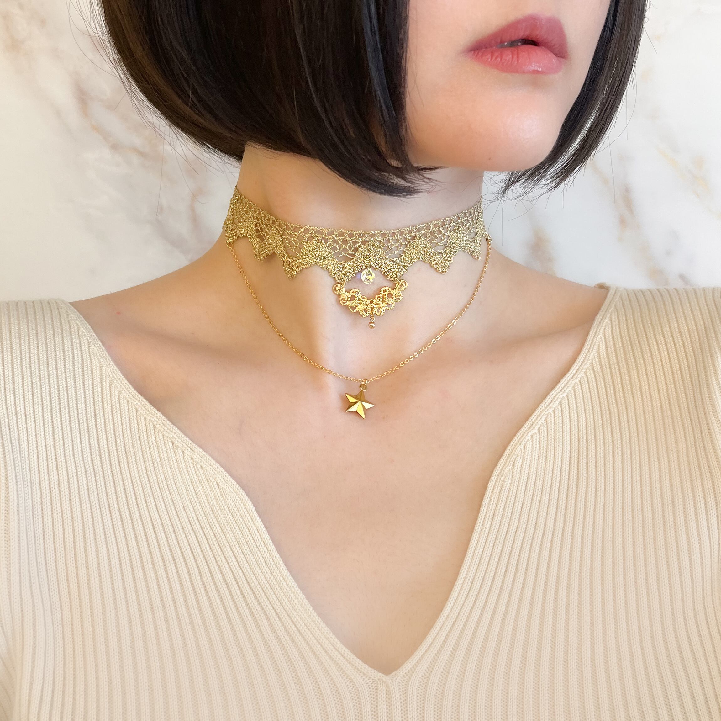 ゴールド:シェヘラザードの首飾り:星とゴールドレースのチョーカー SV105G