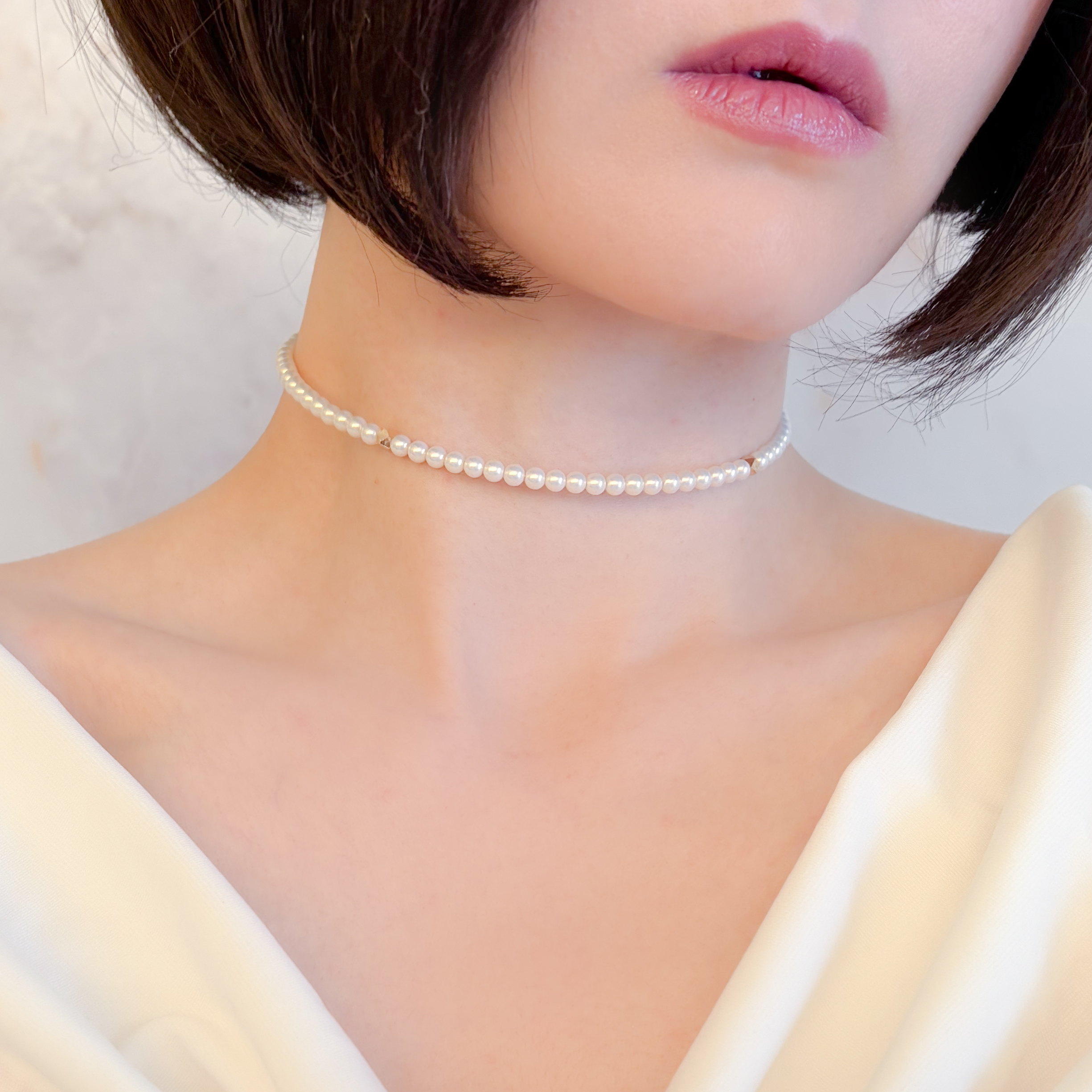 約4mmの小さなプラスチックパールを丁寧に連ね、ゴールドのメタルビーズでさりげないアクセントを添えた、シンプルなワイヤーチョーカー。