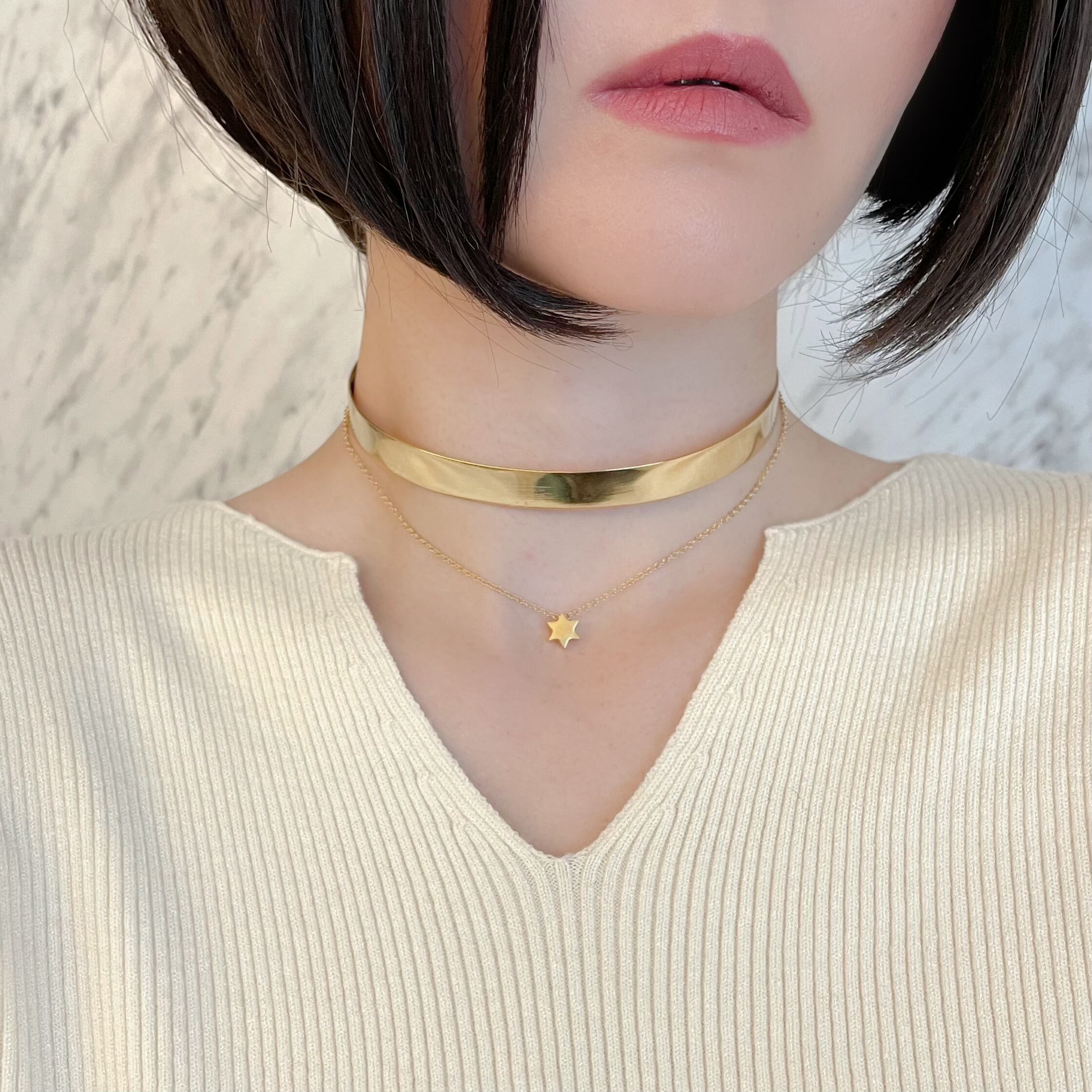 トルコより取り寄せた金属製のチョーカーに大振りチェーンを合わせ、重厚感のある作品に仕立てました。