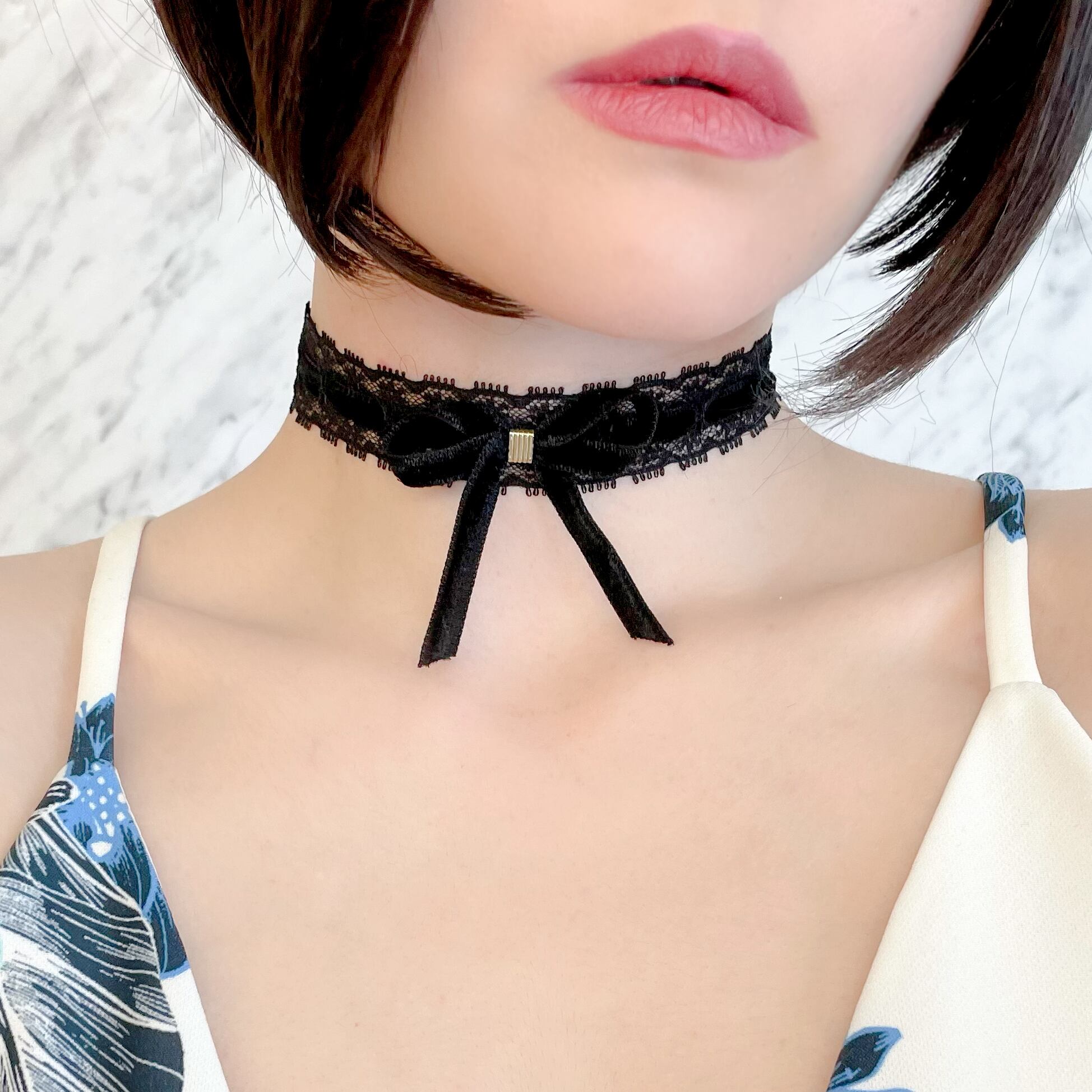 幅2.5センチの黒いレースにベルベットリボンを合わせ、ラブリーなチョーカーに仕立てました。