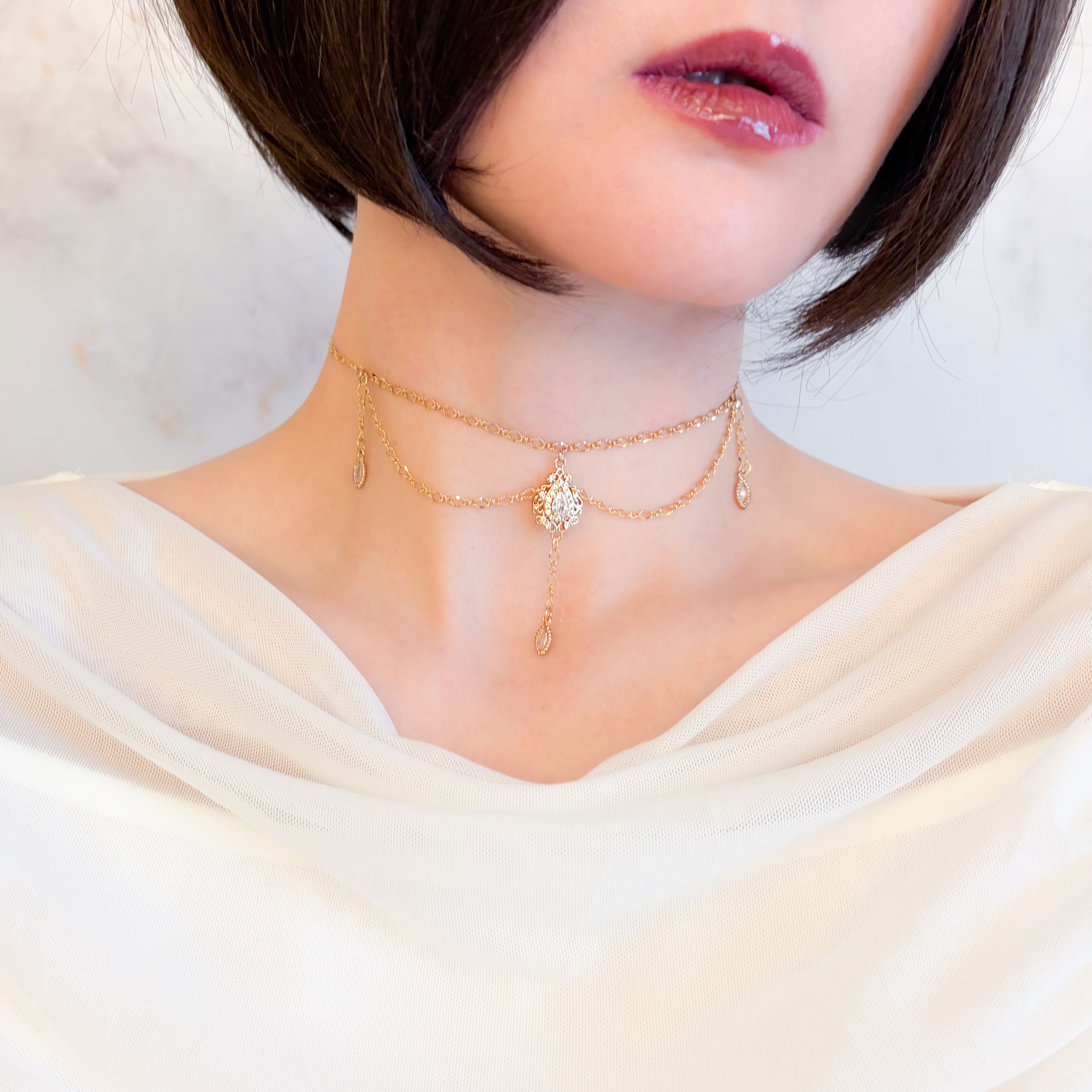 チョーカーのように首元に沿わせて繊細に、少しゆとりを持たせてネックレスとしてエレガントに。