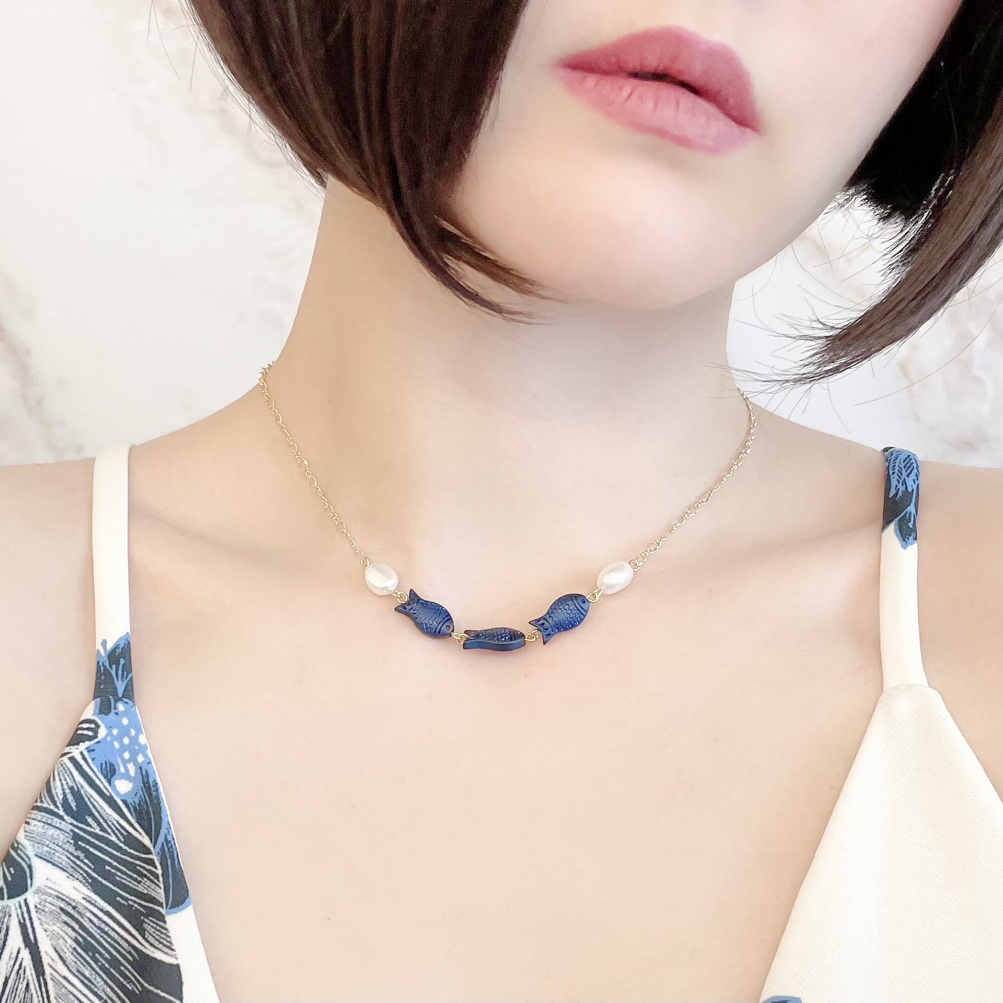 かわいいモチーフですので子供っぽくならないよう、繊細なチェーンと淡水パールに合わせ、シンプルにかつユーモア溢れるチョーカーネックレスに仕立てました。