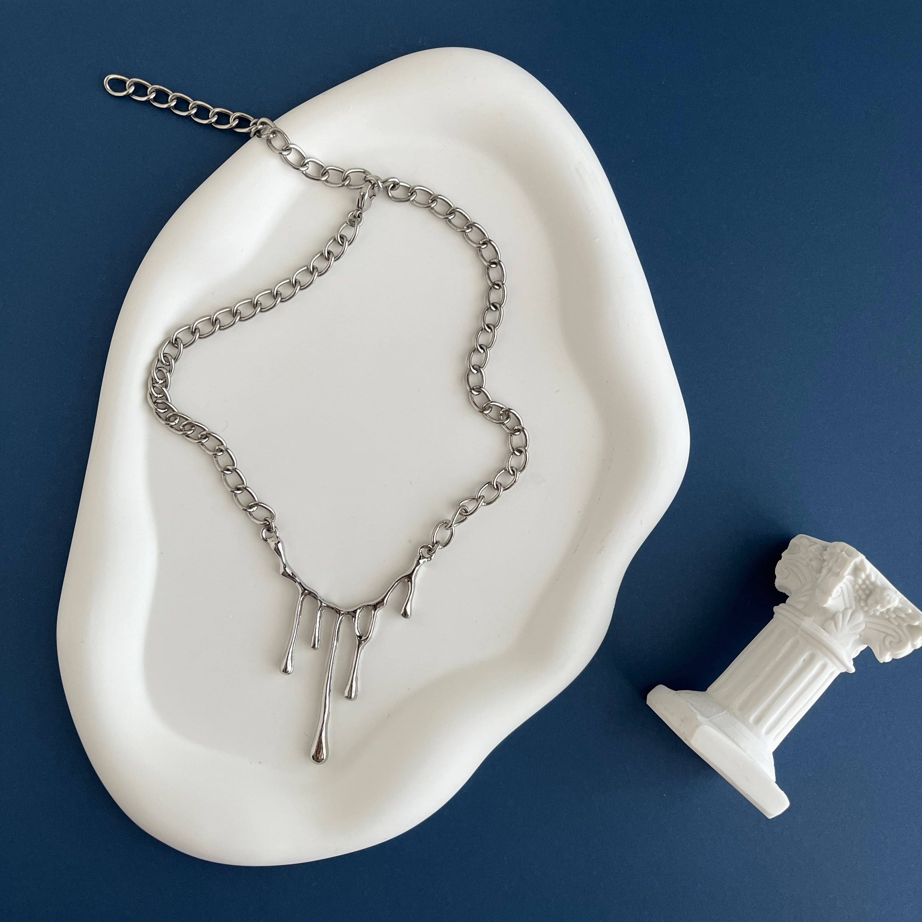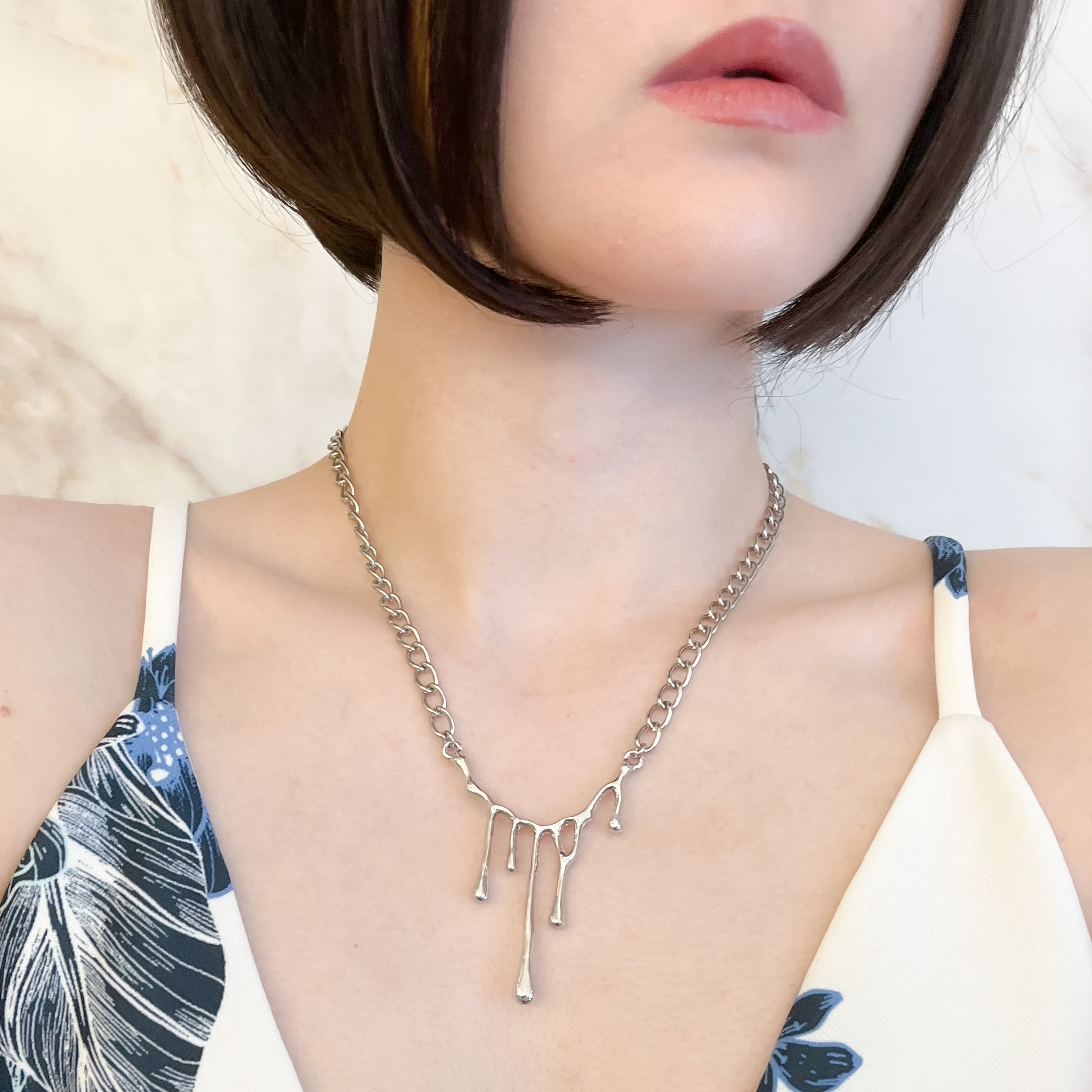 インパクトのある無骨なチェーンに鉄が溶けるような形のチャームを合わせ、ロックなデザインに仕立てました。