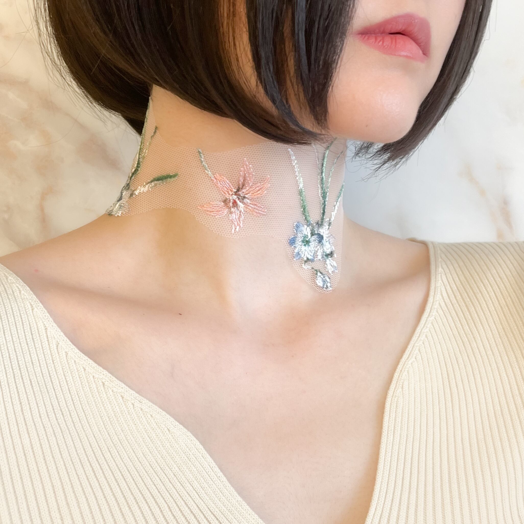 カラフルな花模様のレースを使用し、刺青、タトゥーを入れているかのようなタトゥーチョーカーに仕立てました。