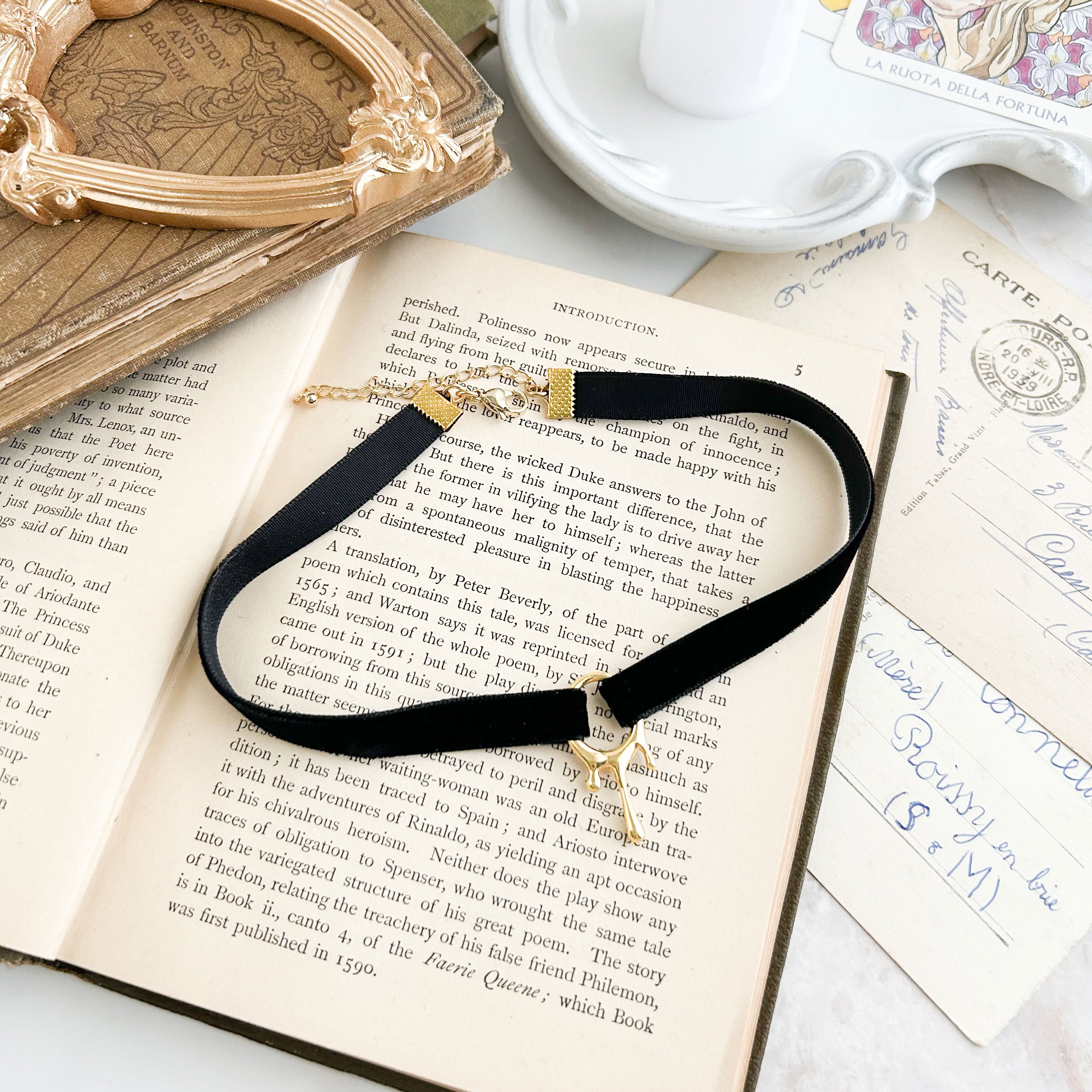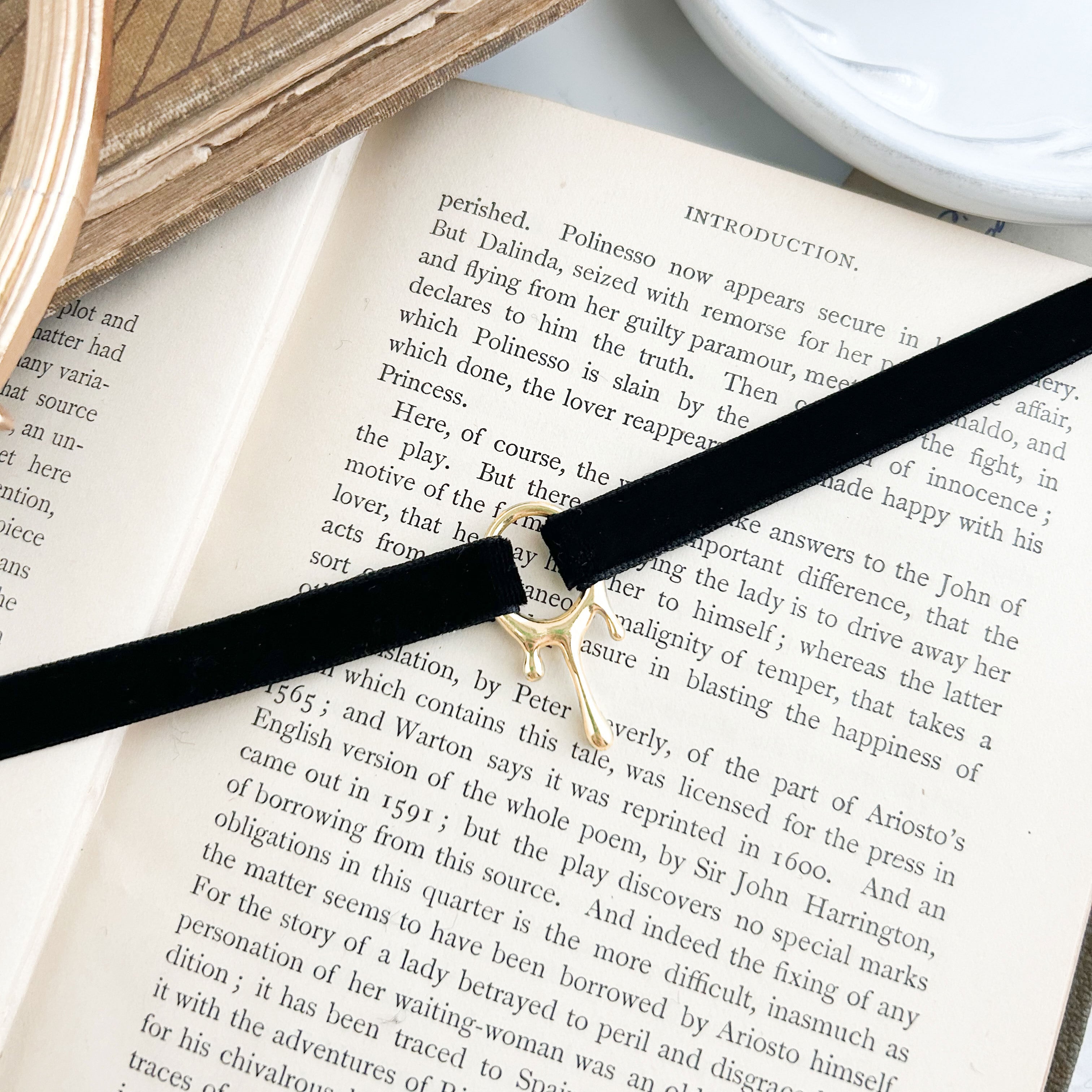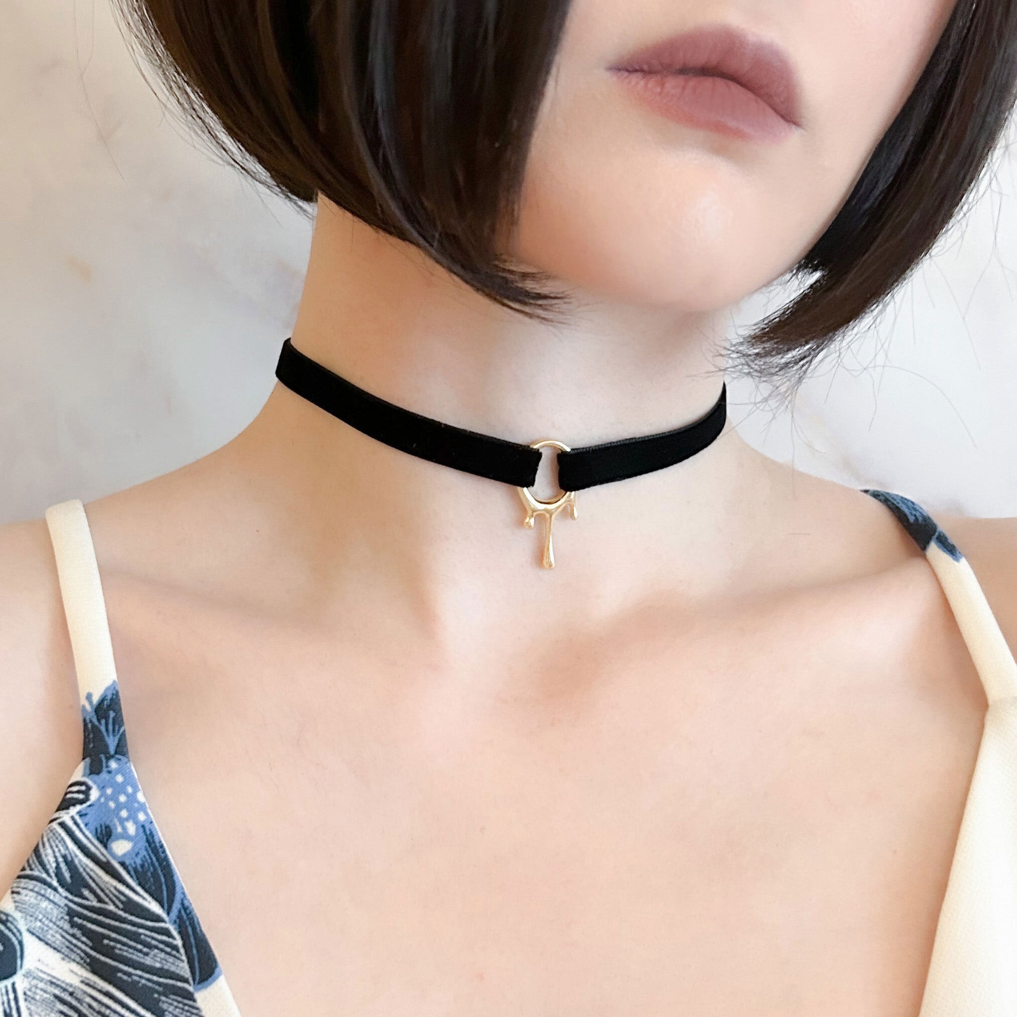 1センチ幅のベルベットリボンに溶けているデザインの丸いチャームを合わせ、シンプルなチョーカーに仕立てました。