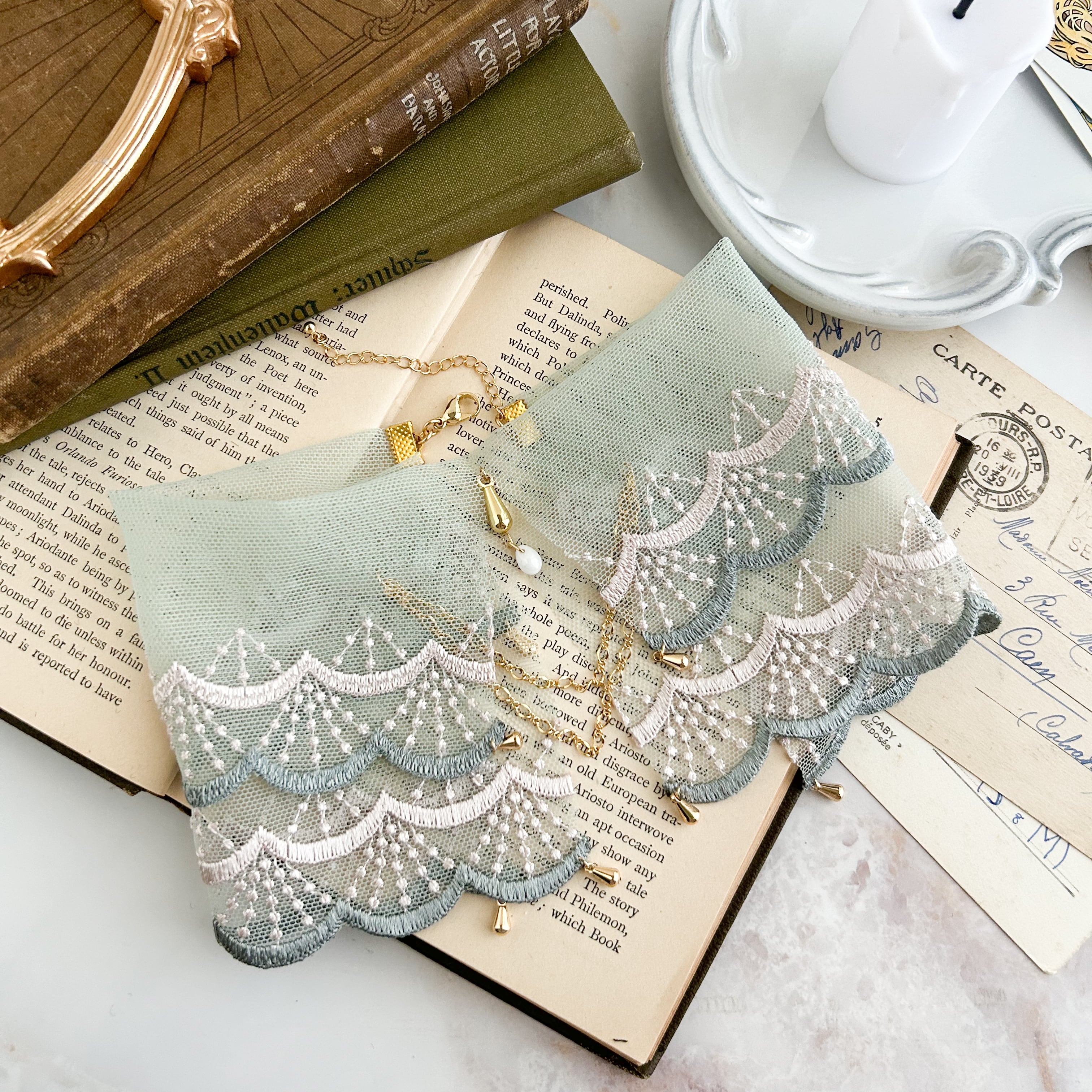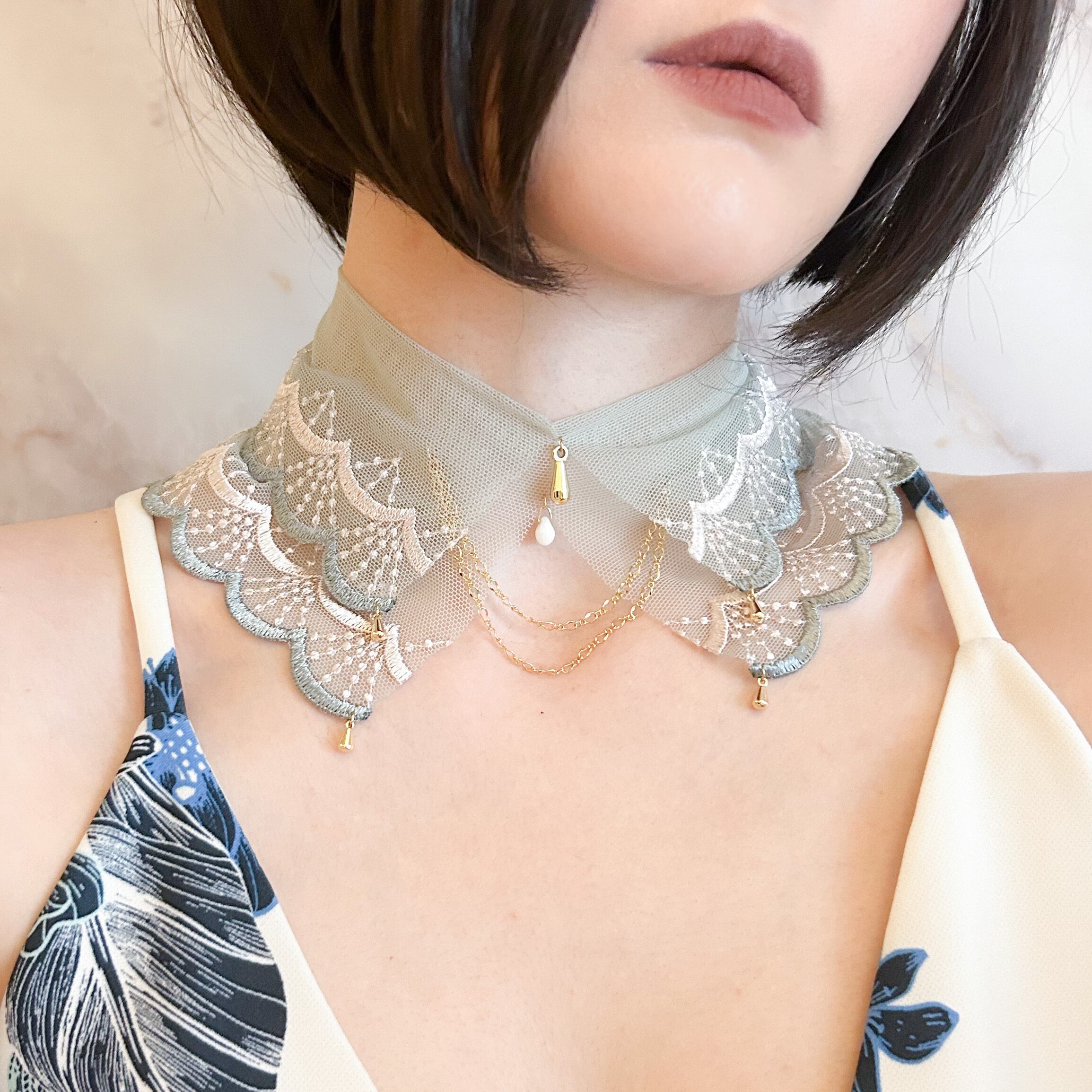 ミントグリーンの透け感が美しい幅広のレースを折り曲げて、繊細でゴージャスな付け襟のようなチョーカーに仕立てました。